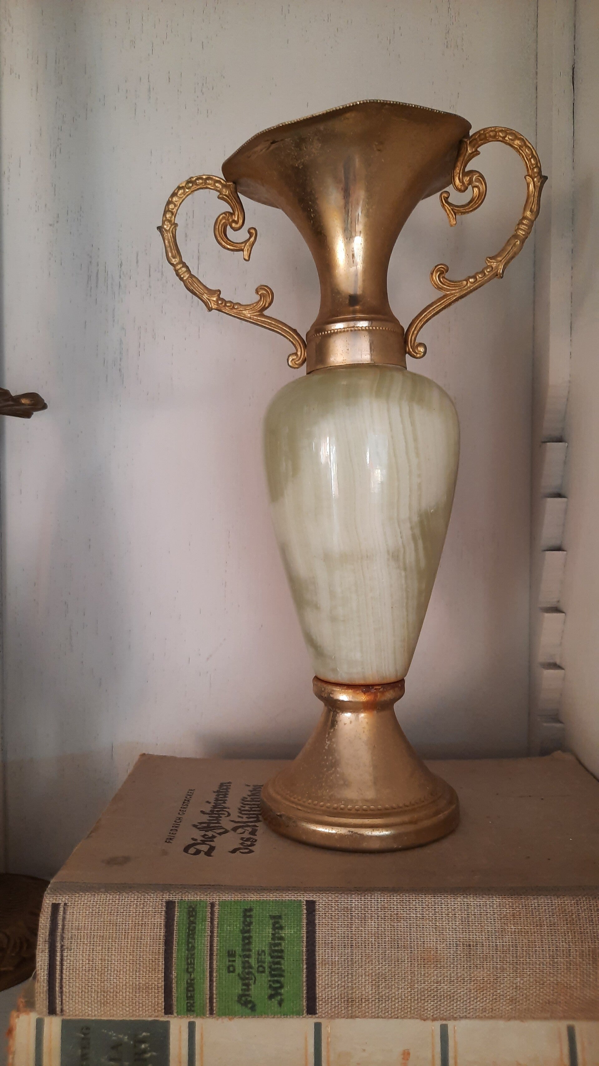 A beautiful vintage small vase crafted from white and green onyx with brass accents.