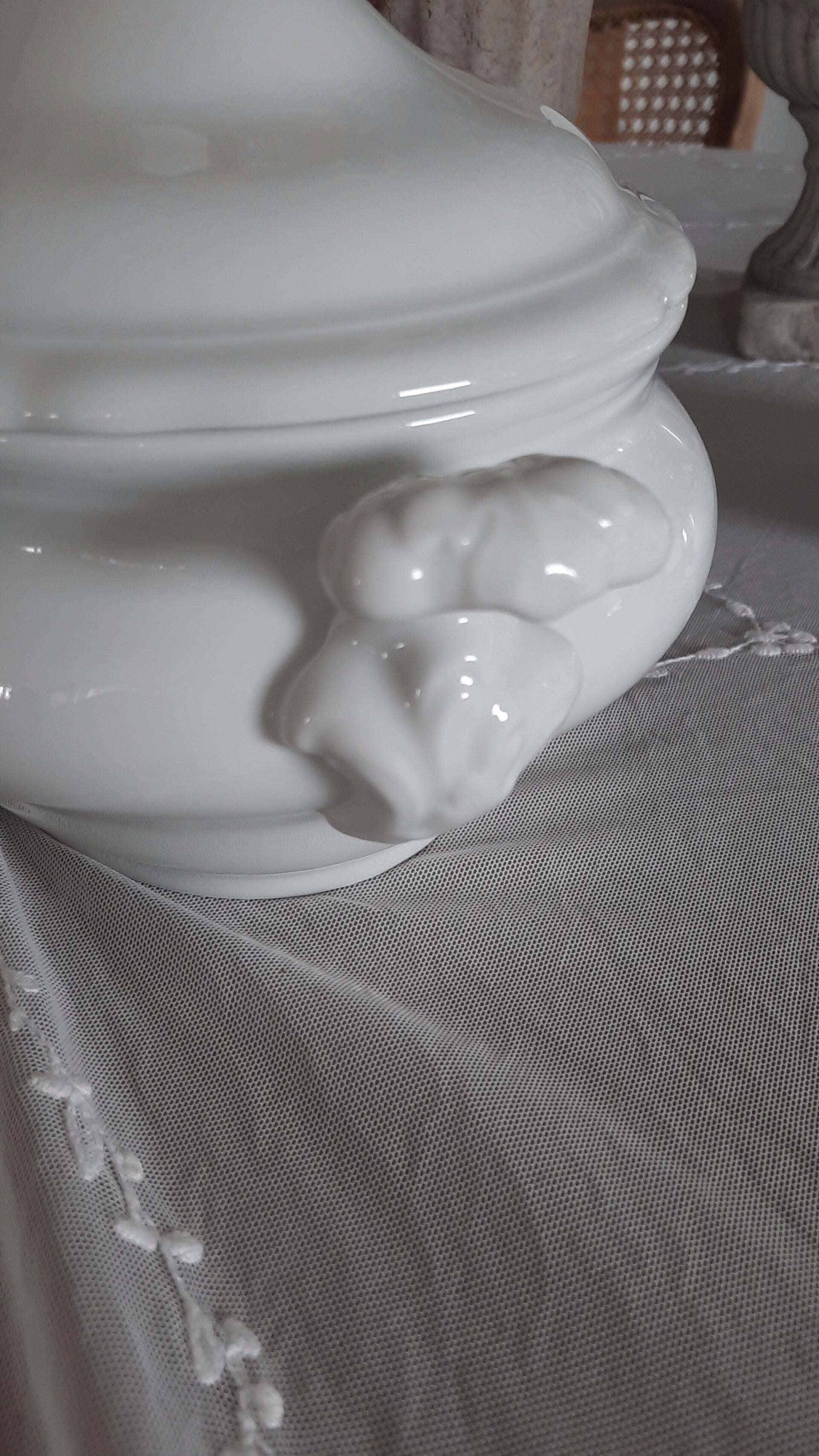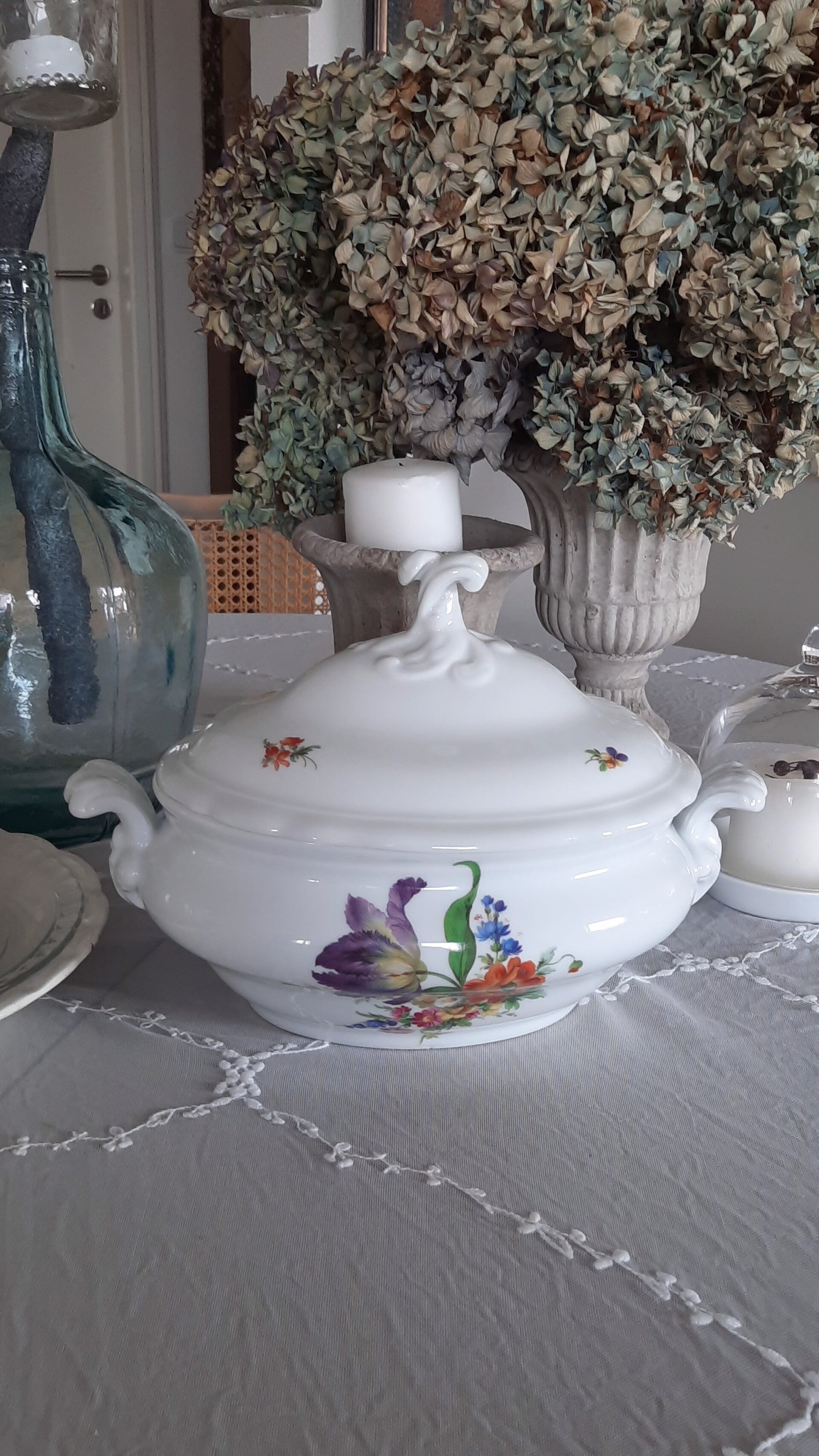 A beautiful vintage tureen with lid in white porcelain with floral pattern. Marked on the bottom Hutschenreuther Germany.