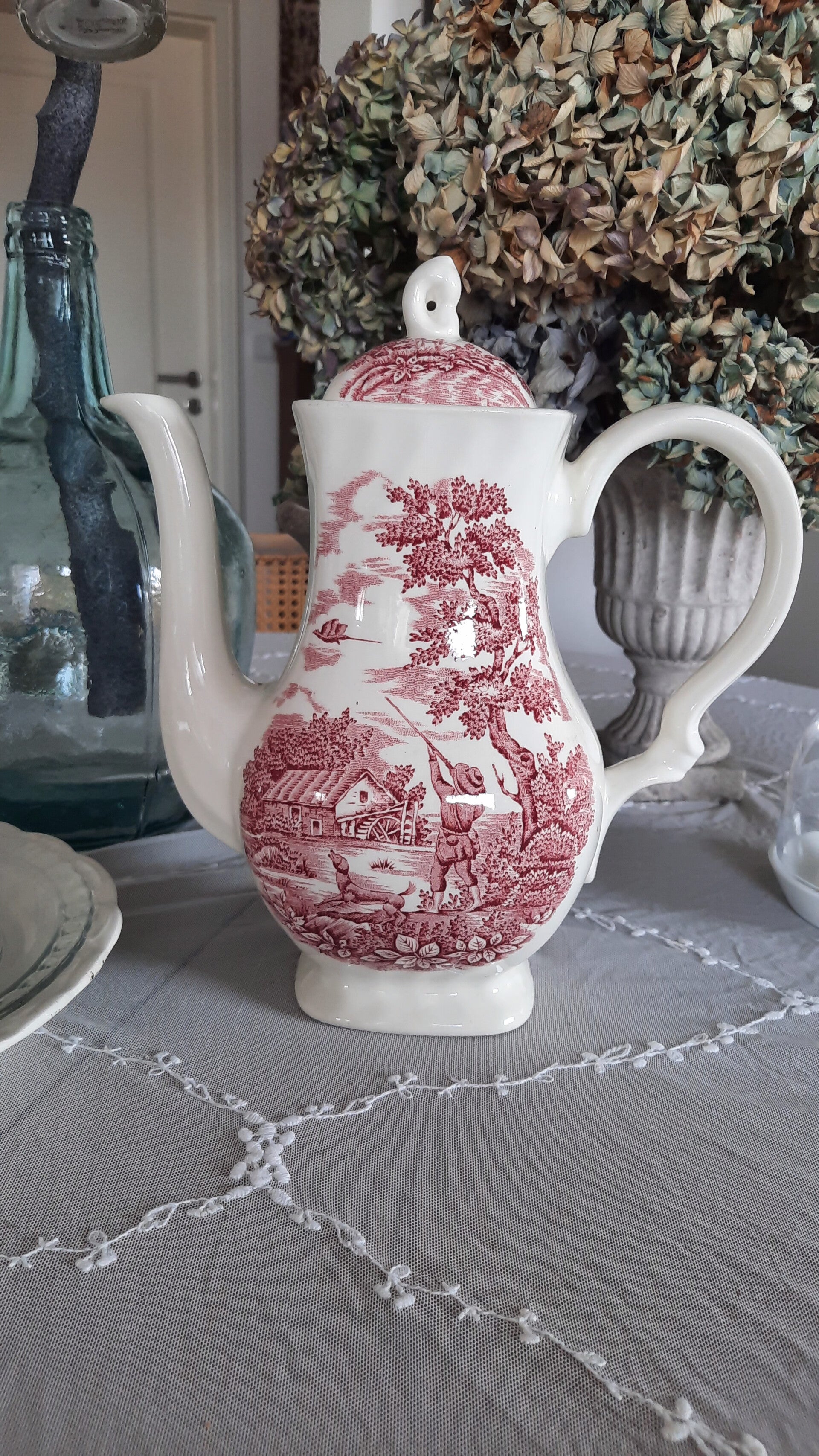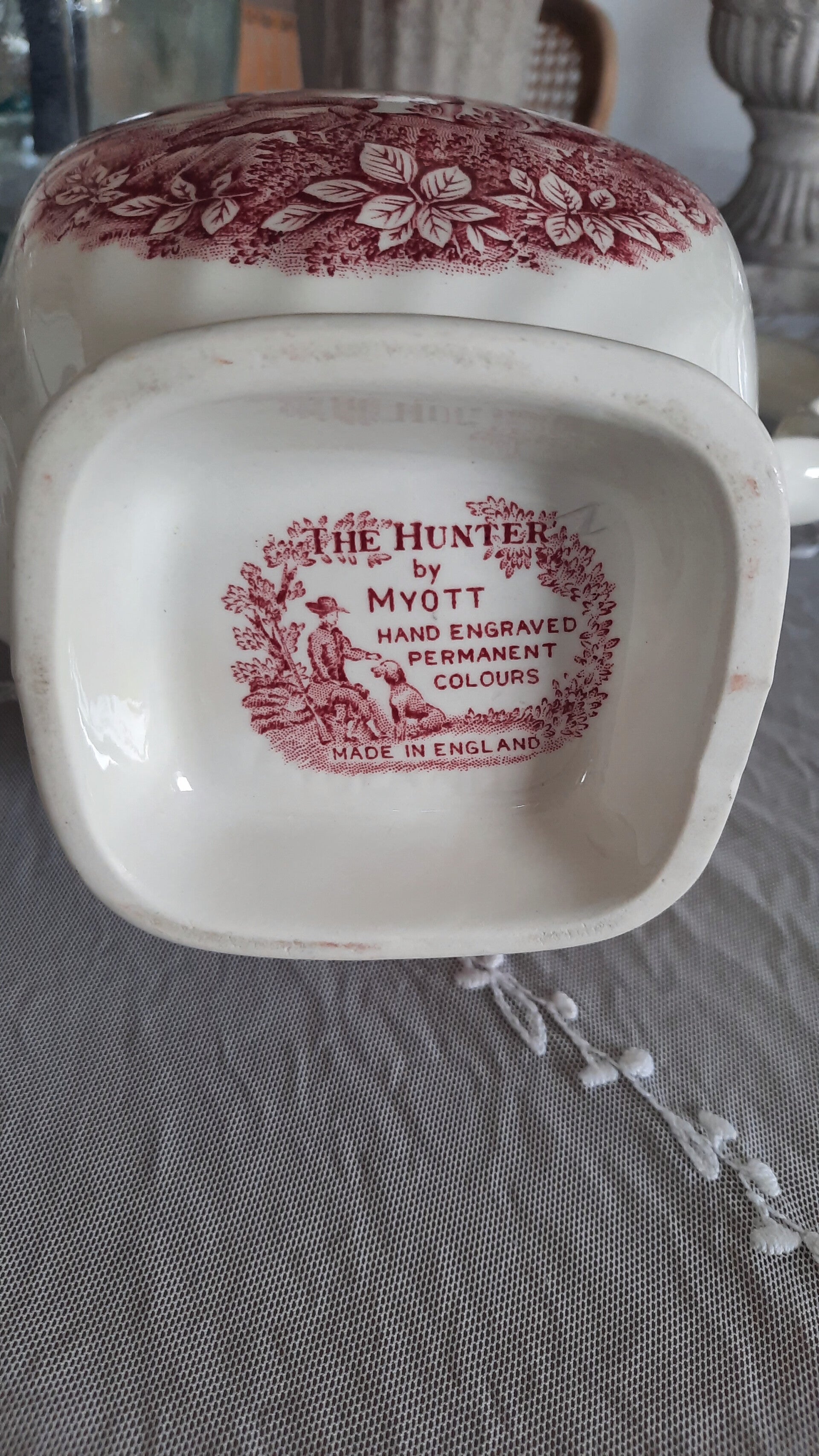 A beautiful vintage red transferware tea/coffee pot by Myott England, depicting an English hunting scene. Marked on the bottom: The Hunter by Myott, Hand engraved, permanent colors, Made in England.