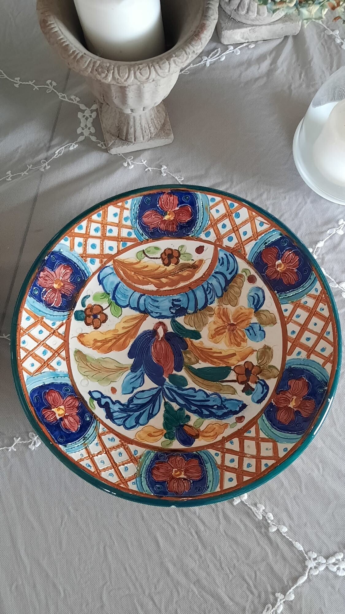 A beautiful rustic ceramic wall plate with engraved floral motifs in vivid colors. There is a cord on the back for wall hanging. Handmade and hand-painted.