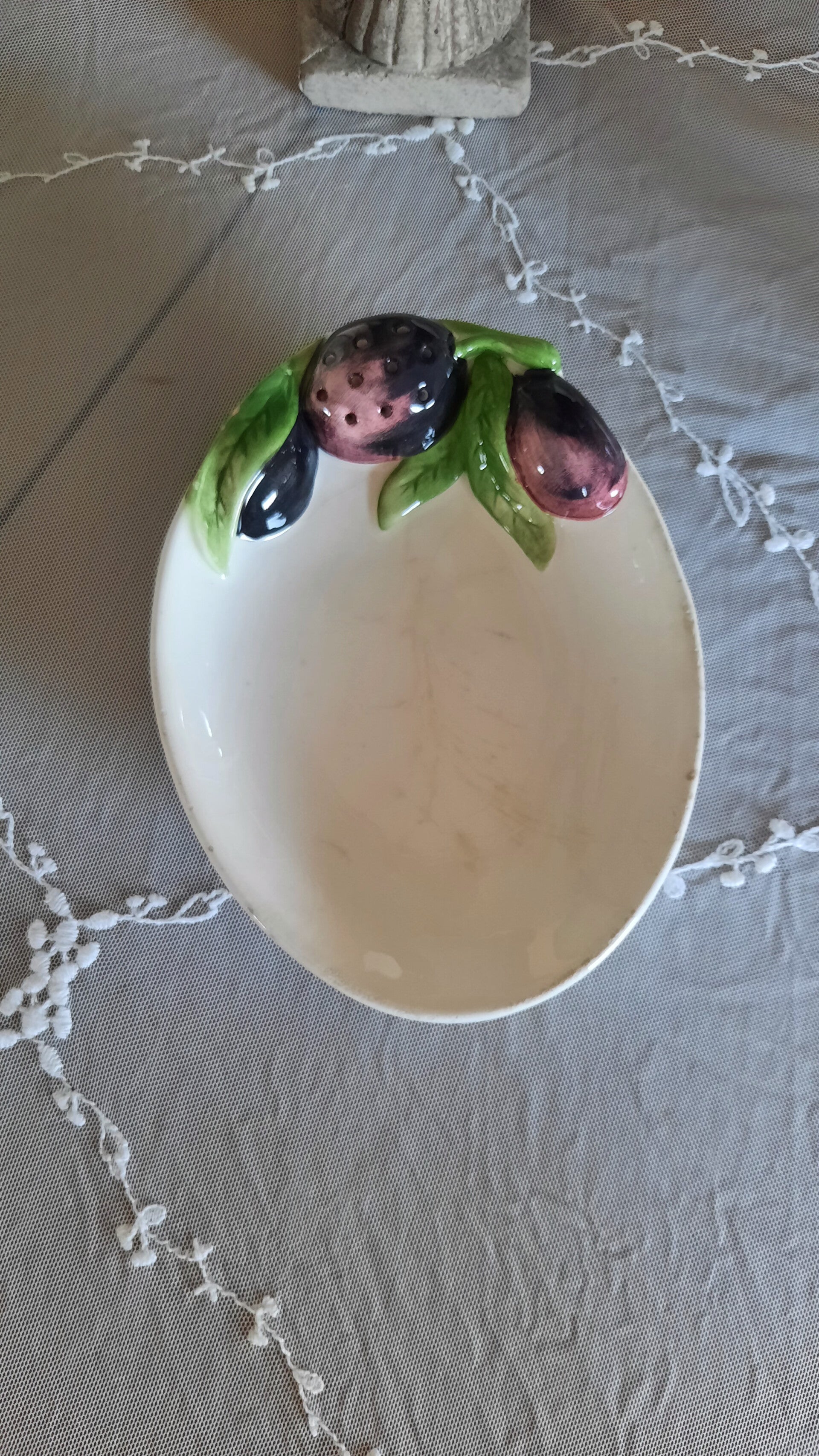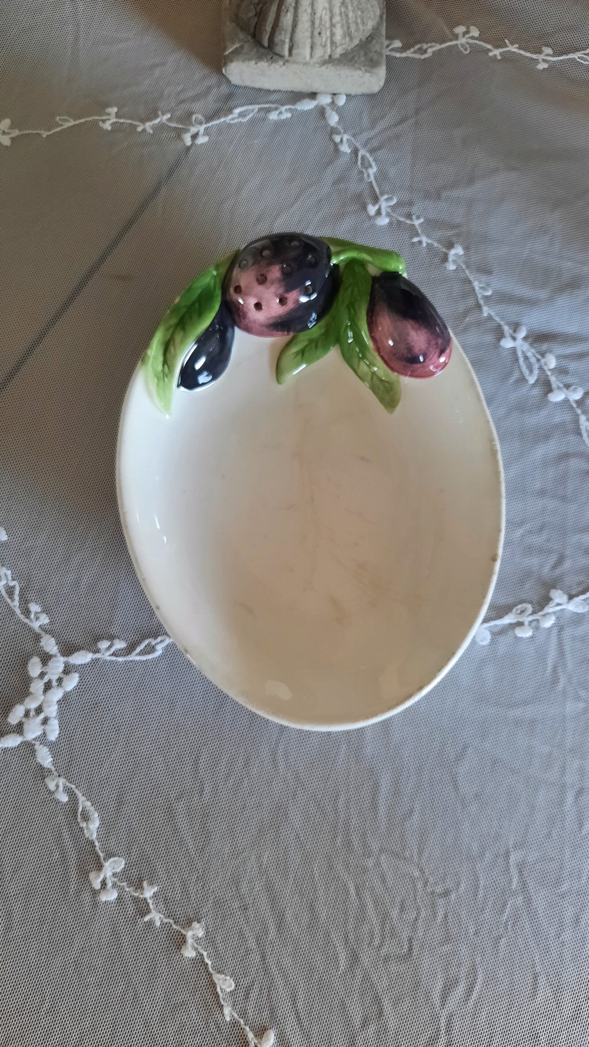 A rustic vintage small plate in white color with a plum relief motif in vivid colors. Hand-made and hand-painted. Made in Italy, signed on the base.