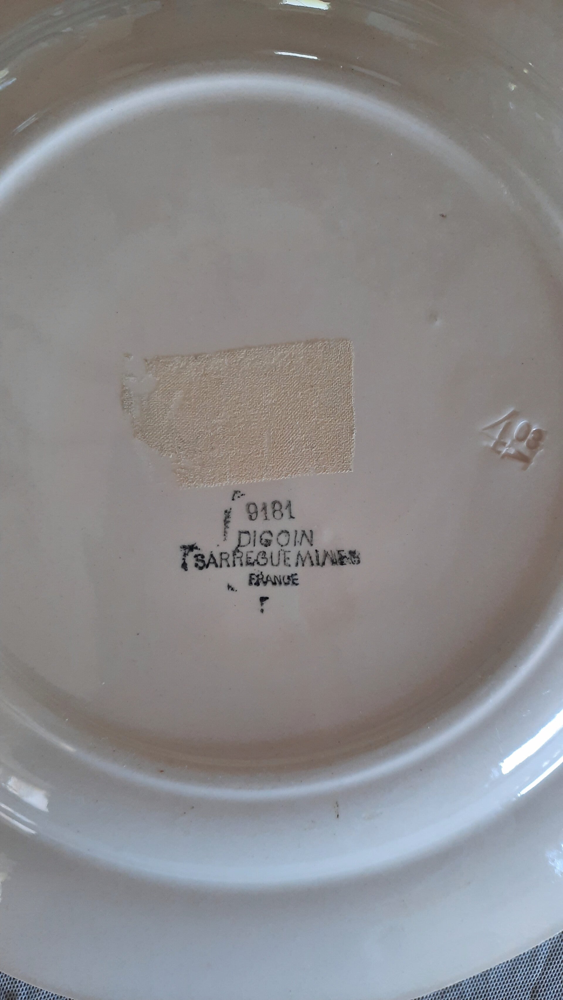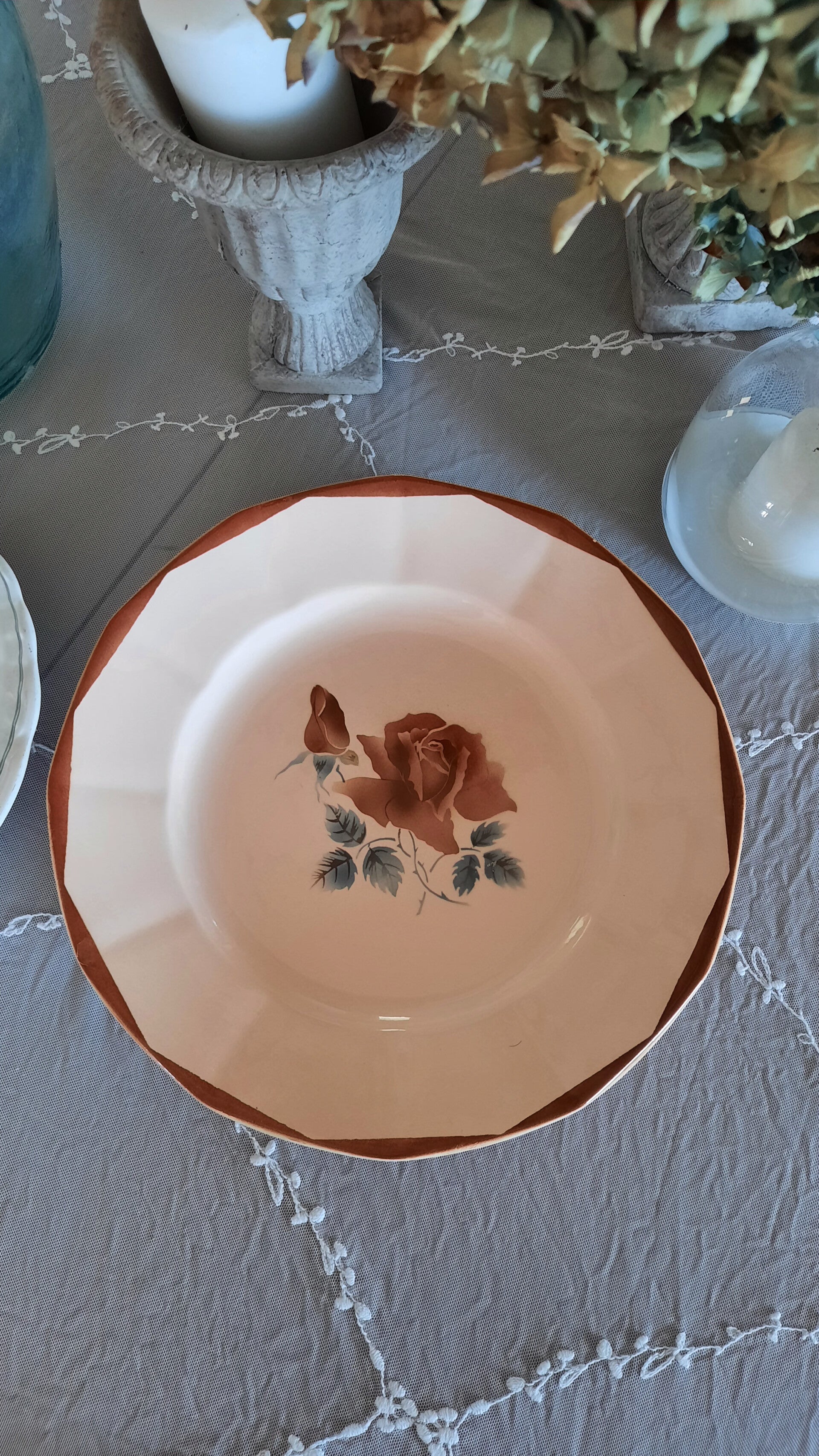 A beautiful vintage plate in pastel peach-pink color with a vintage rose motif. Made in France in the 1930s. Marked on the bottom: Digoin Sarreguemines France.