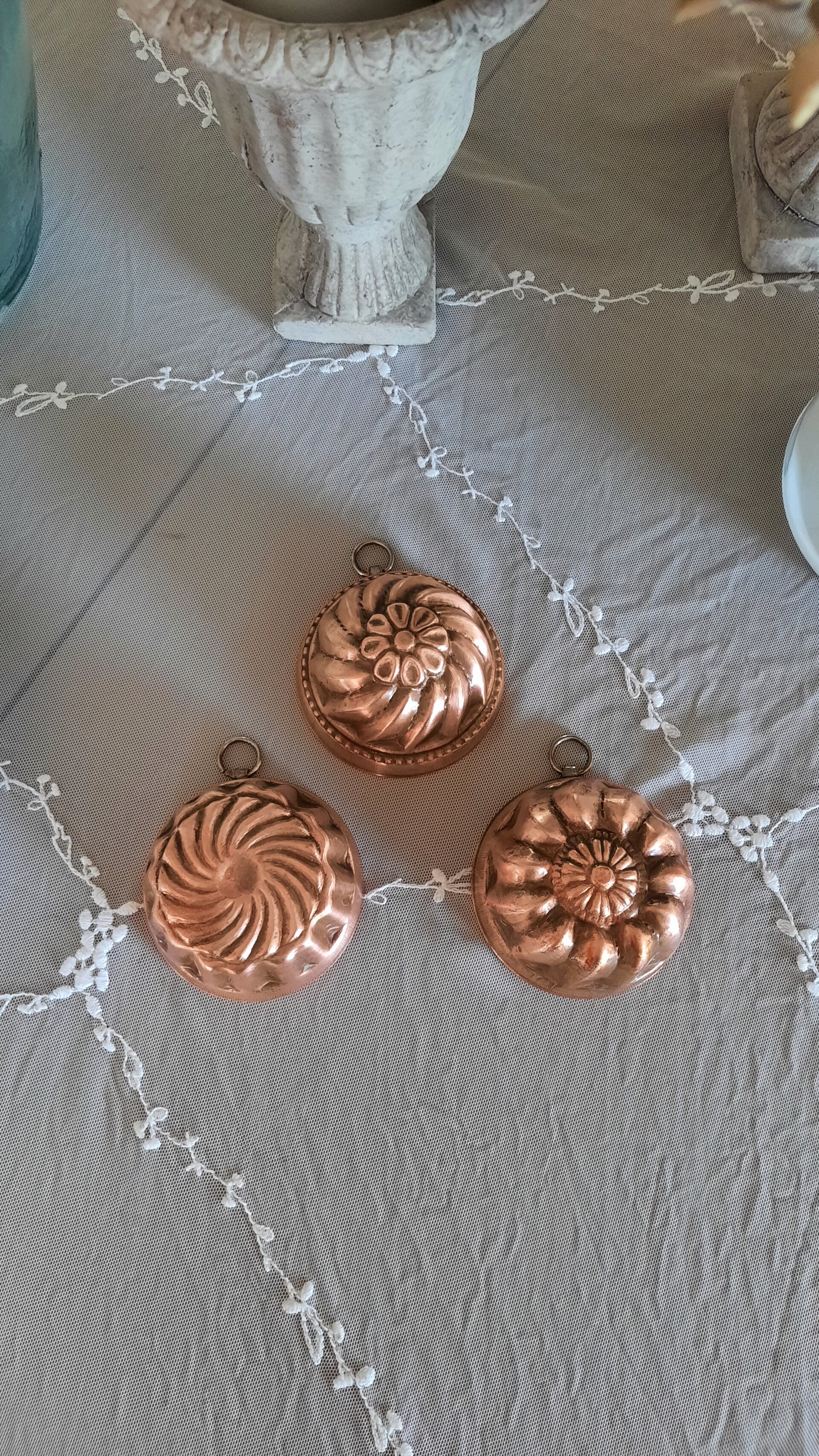 Set of 3 small vintage copper molds. Great as kitchen decor. Each mold has a metal ring for wall hanging. From the 1970s.