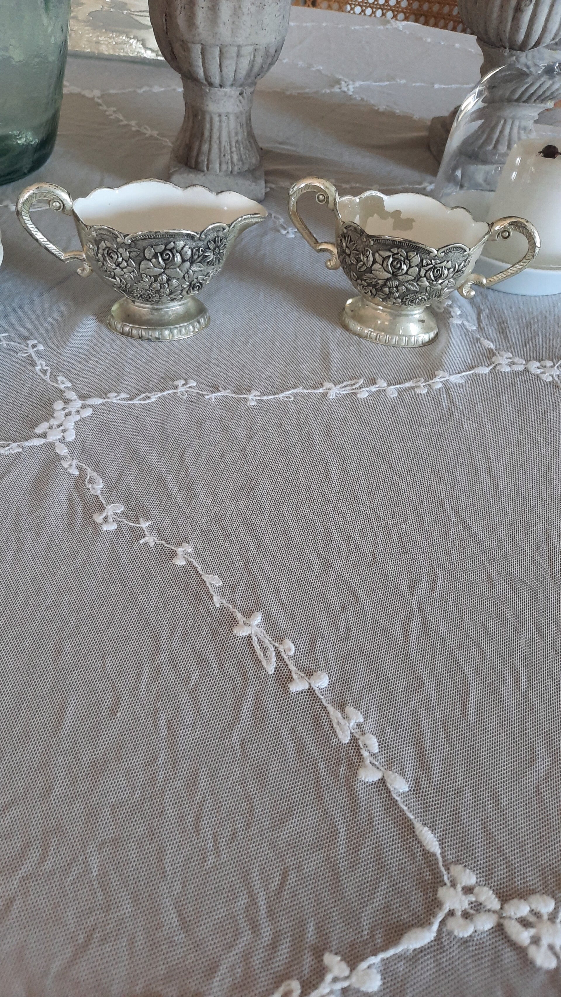 A gorgeous vintage silver-plated set of creamer and sugar bowl in elegant Victorian style. Vintage from the 1970s. Made of heavy metal with silver plating.