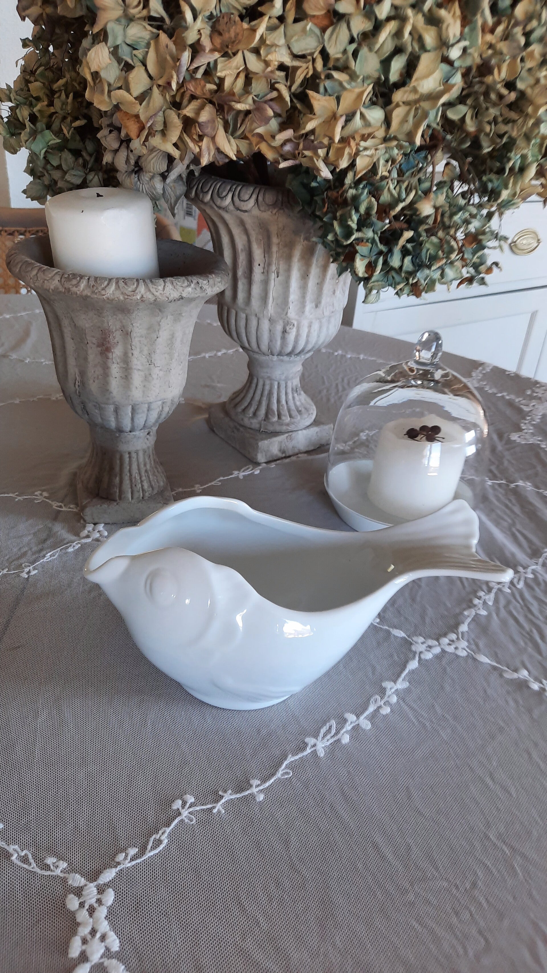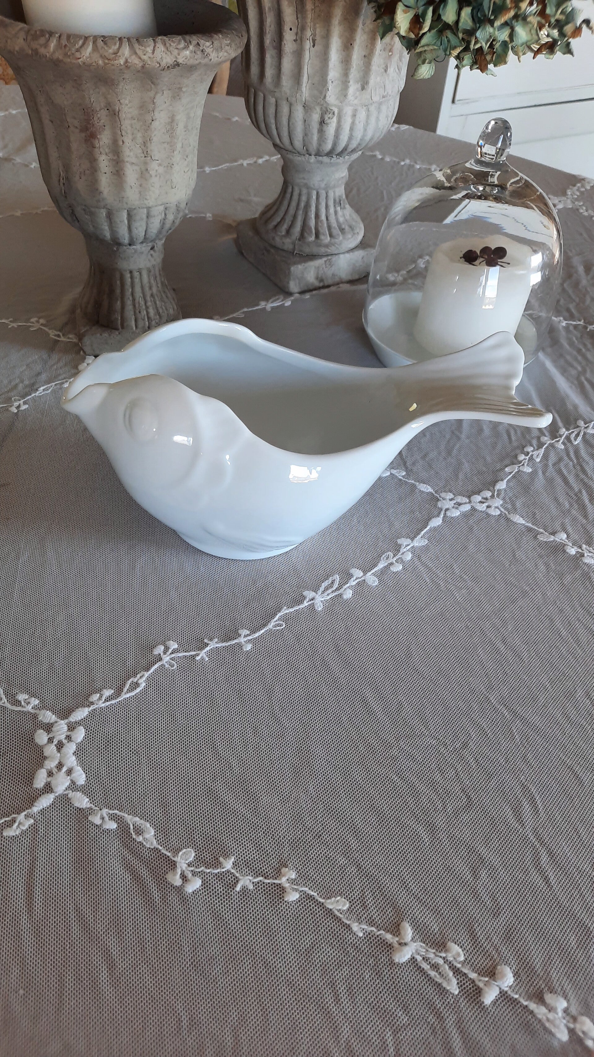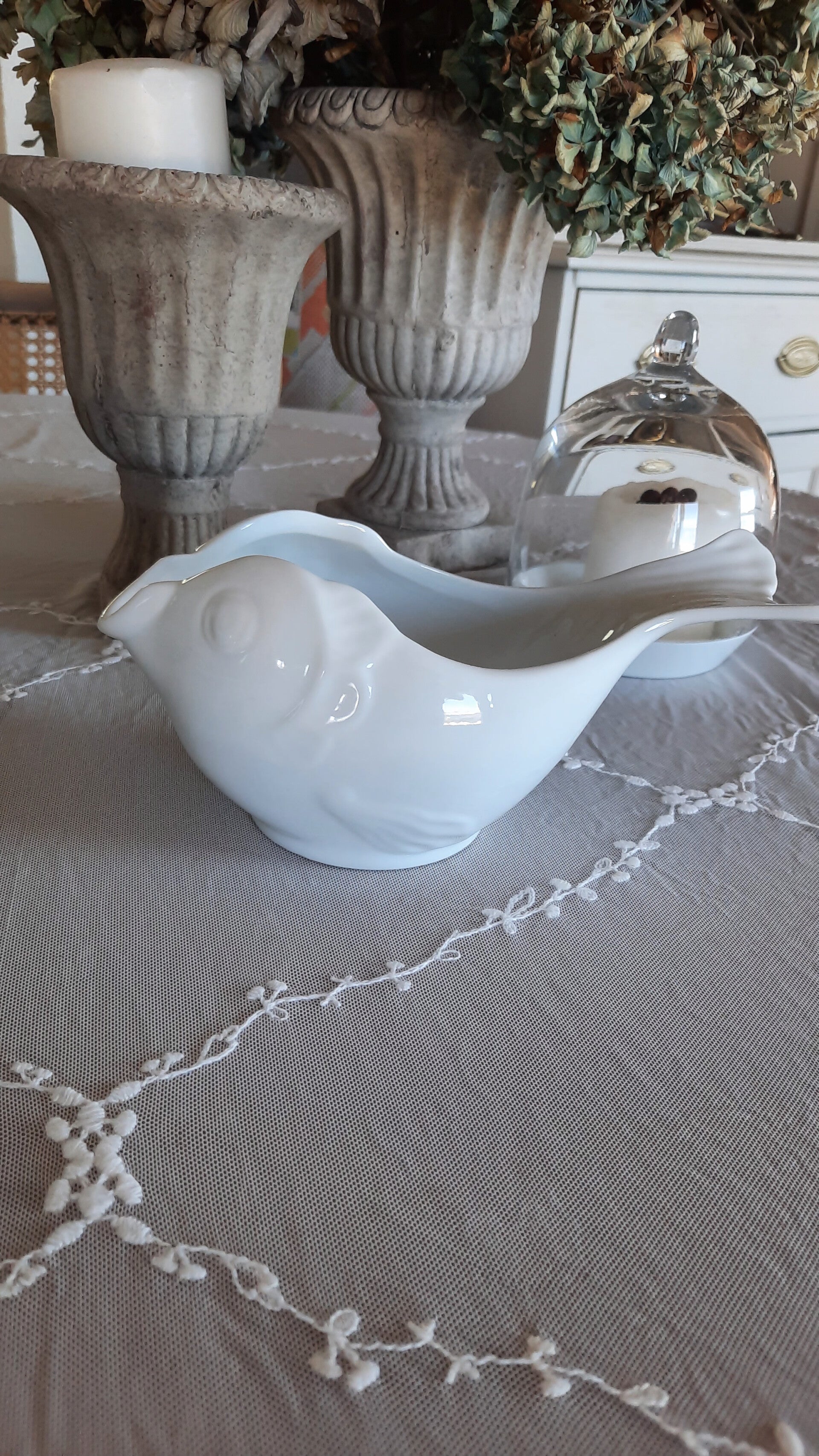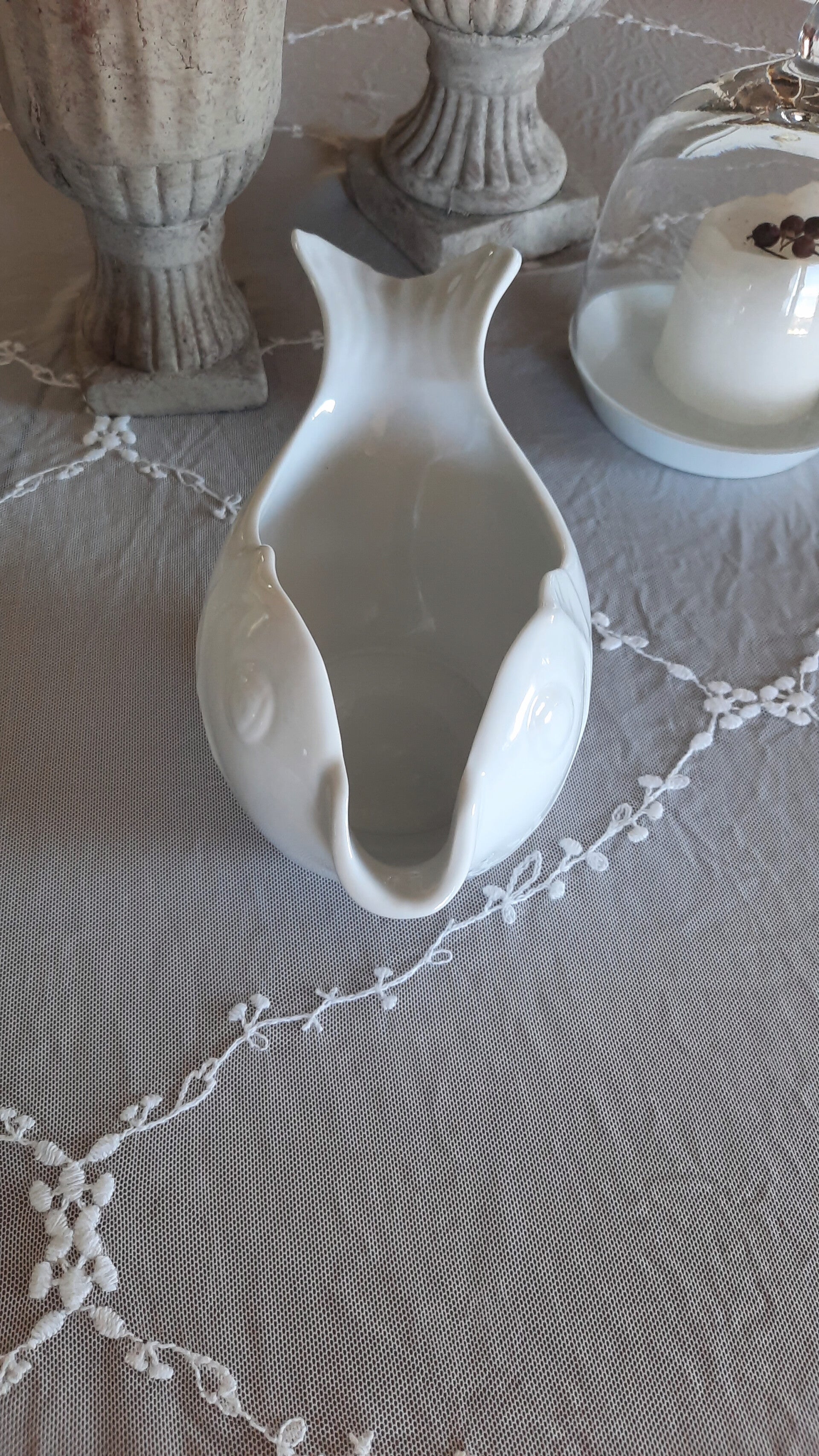 A beautiful ceramic sauce boat in fish shape in white colour with raised details.