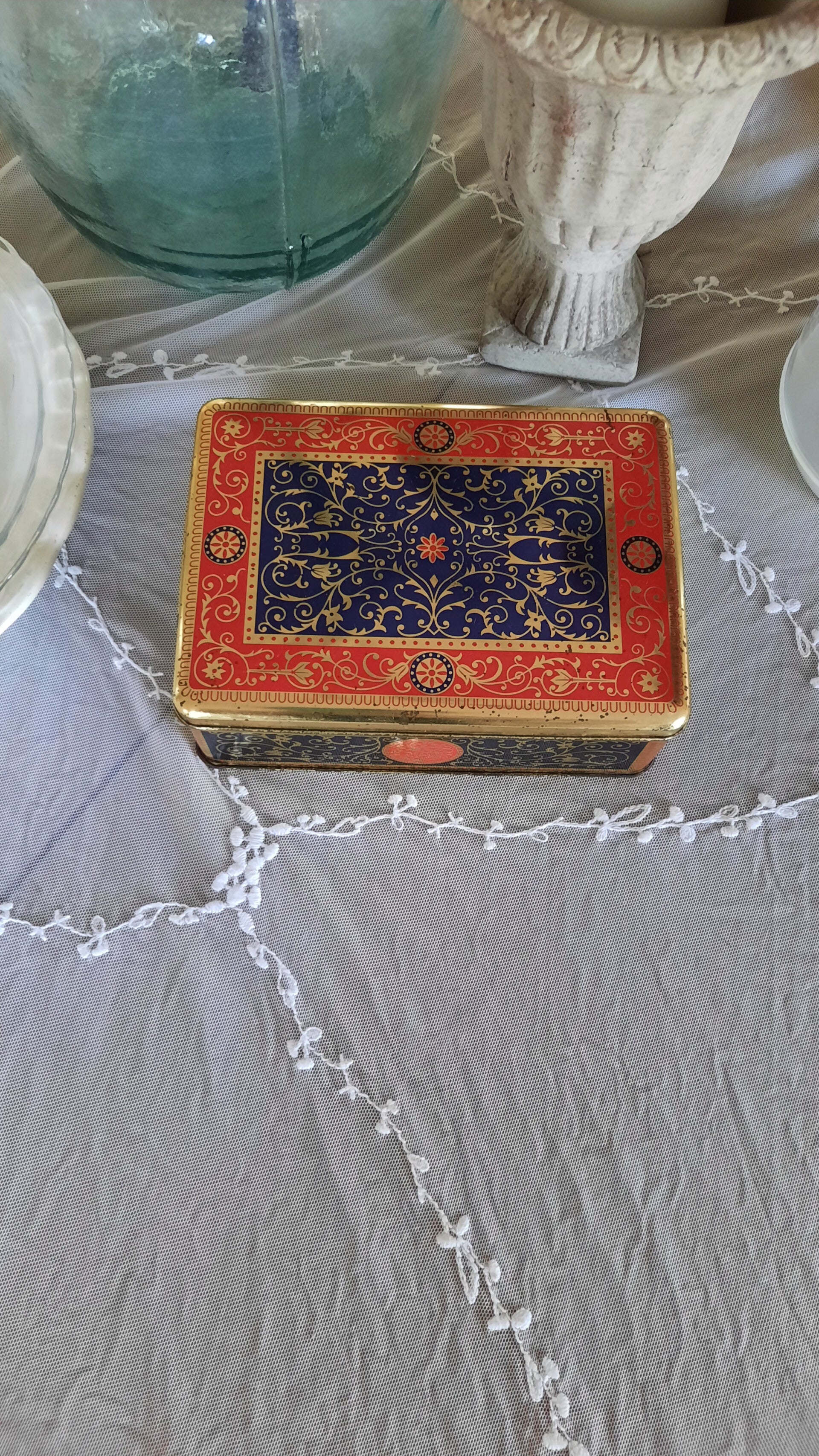 A beautiful ornate tin box in gold, blue, and red with beautiful patterns. From the 1960s.