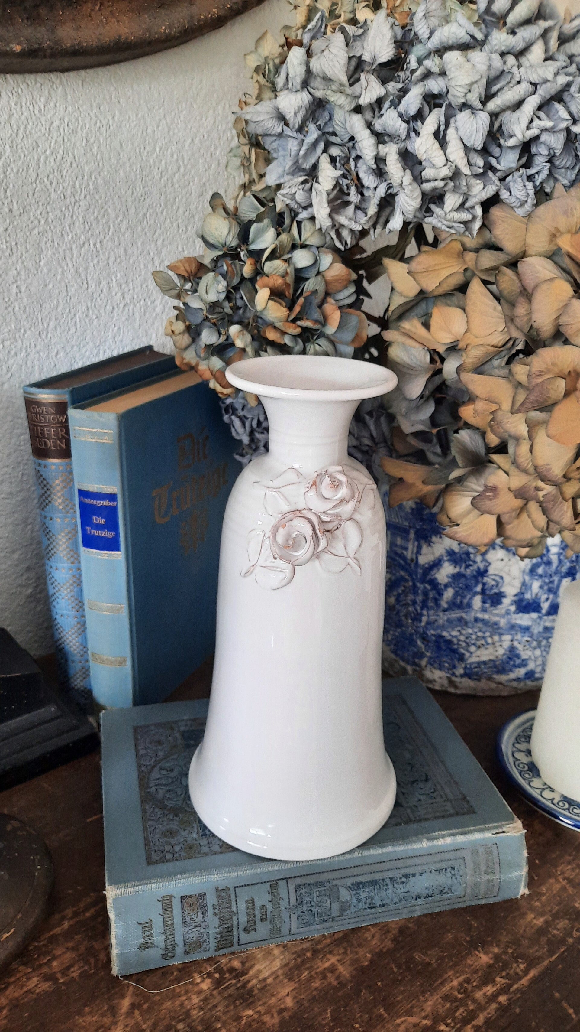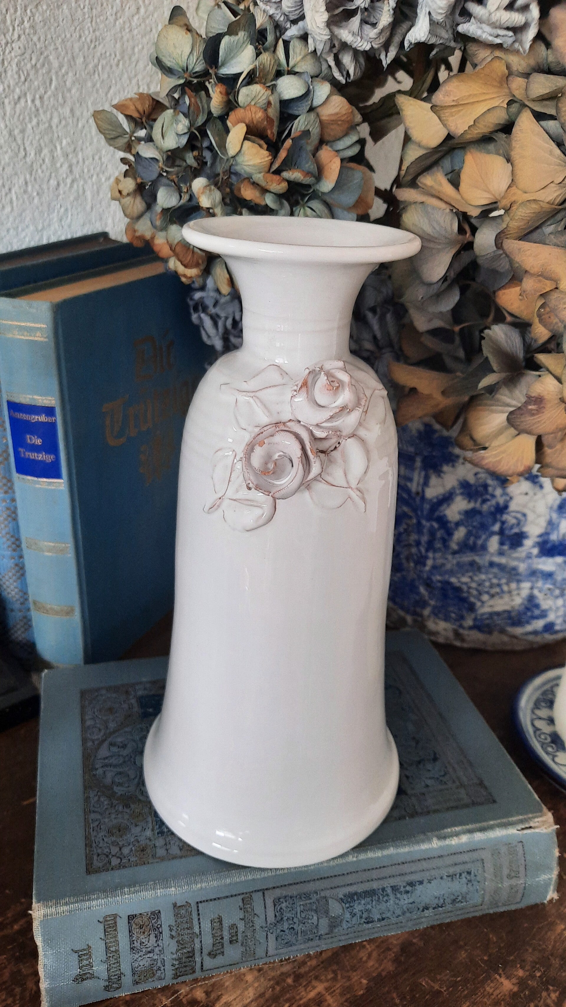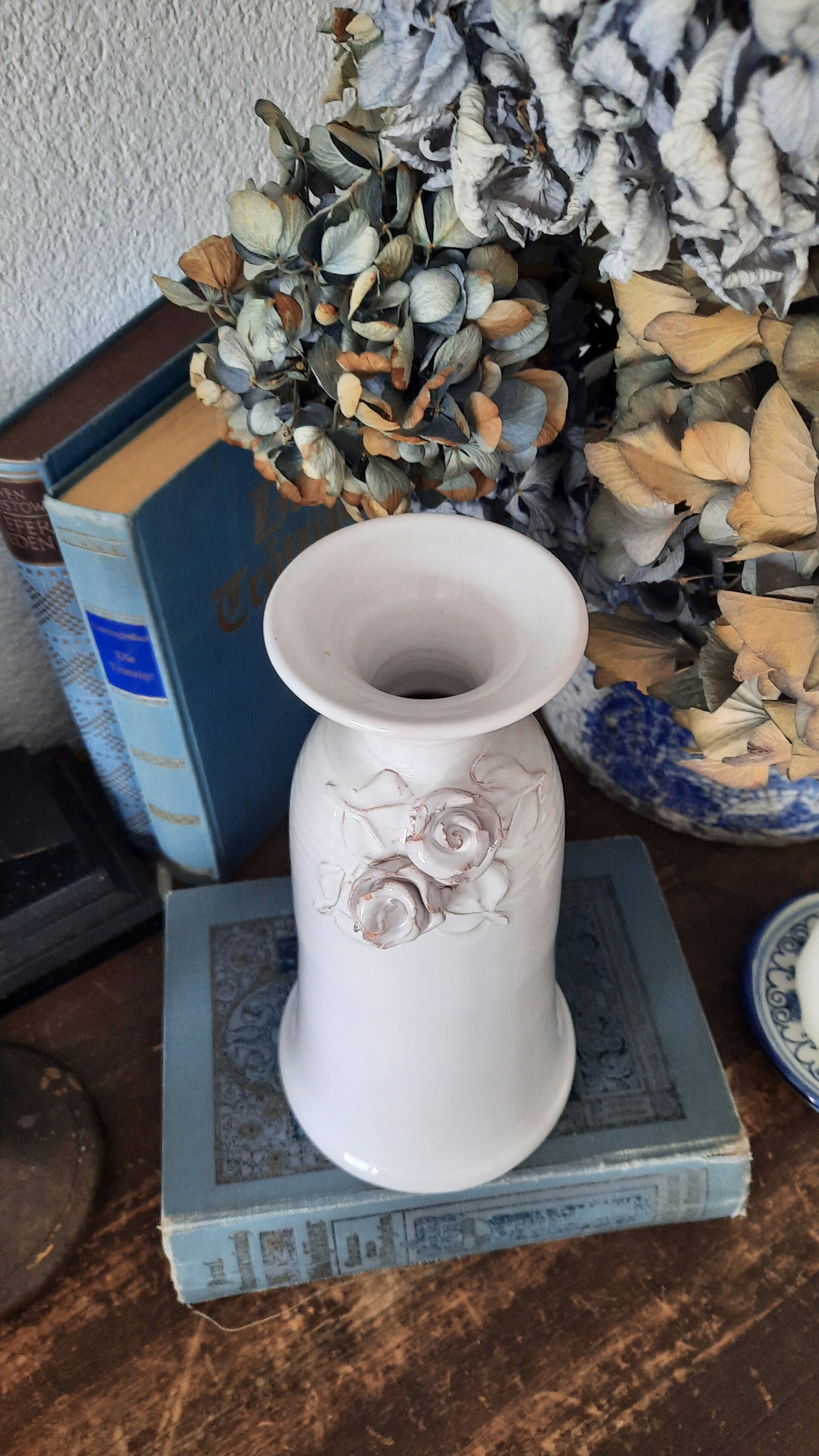 A lovely ceramic vase featuring beautiful raised white roses with light pink edges on the petals.