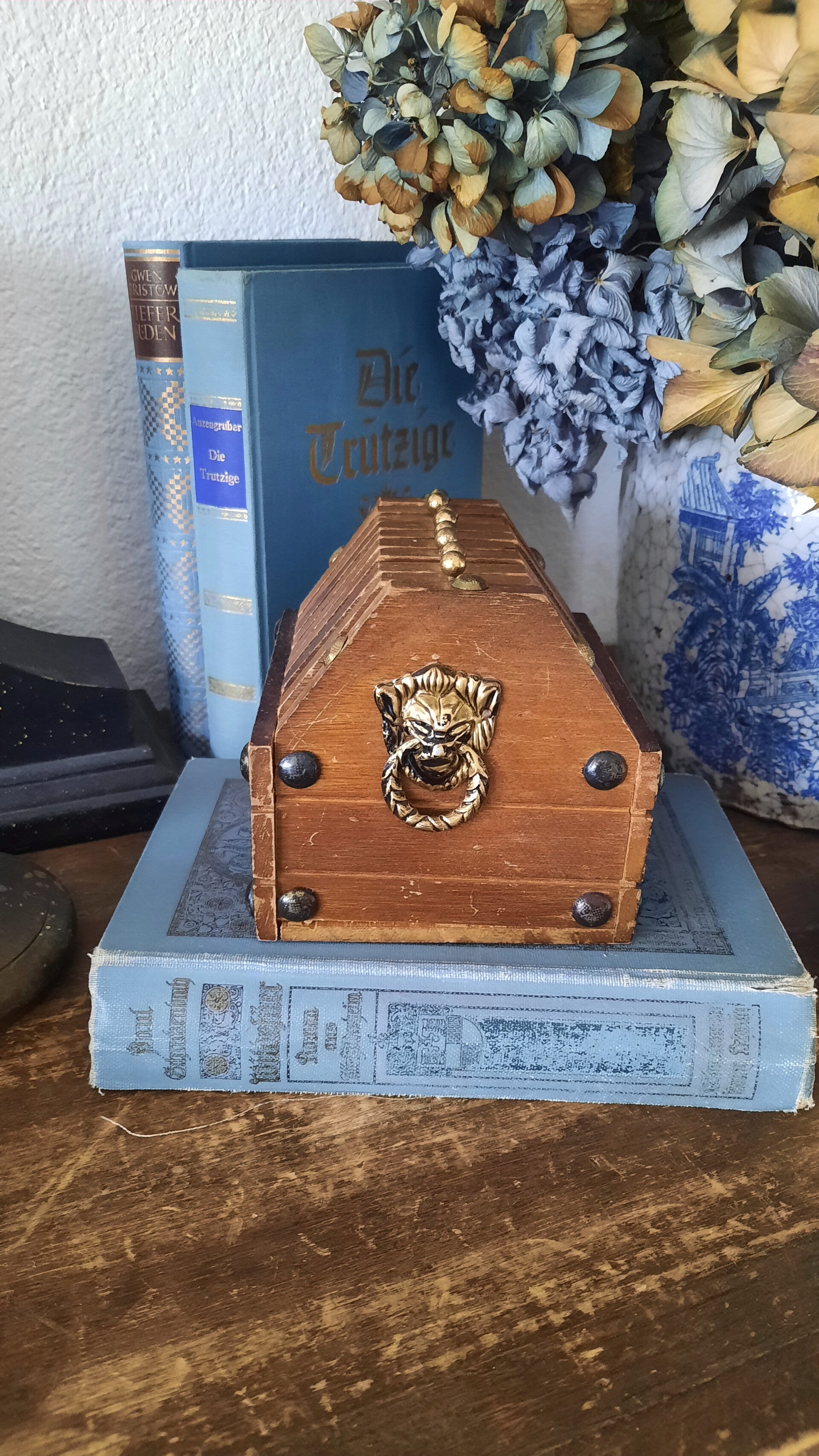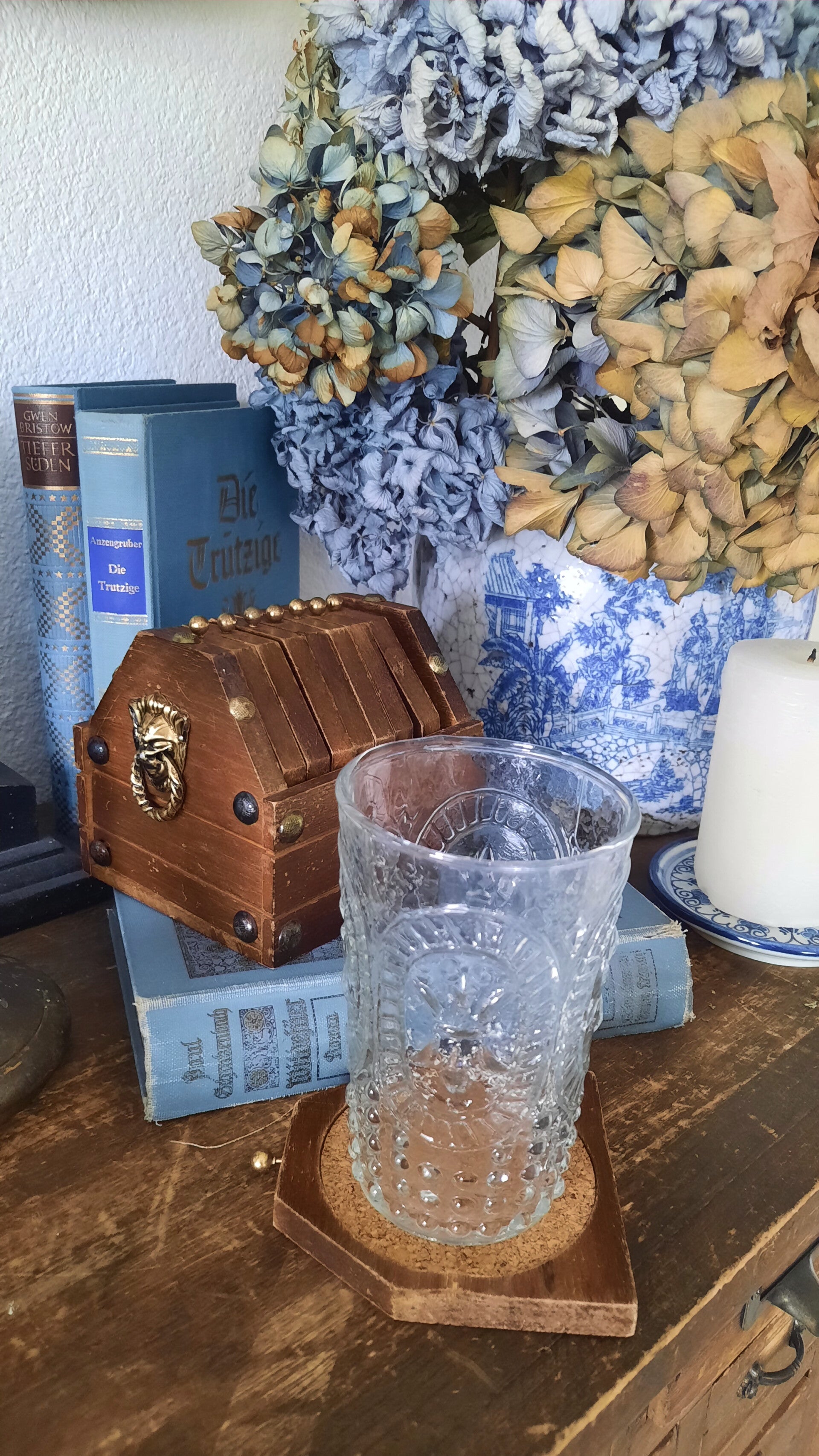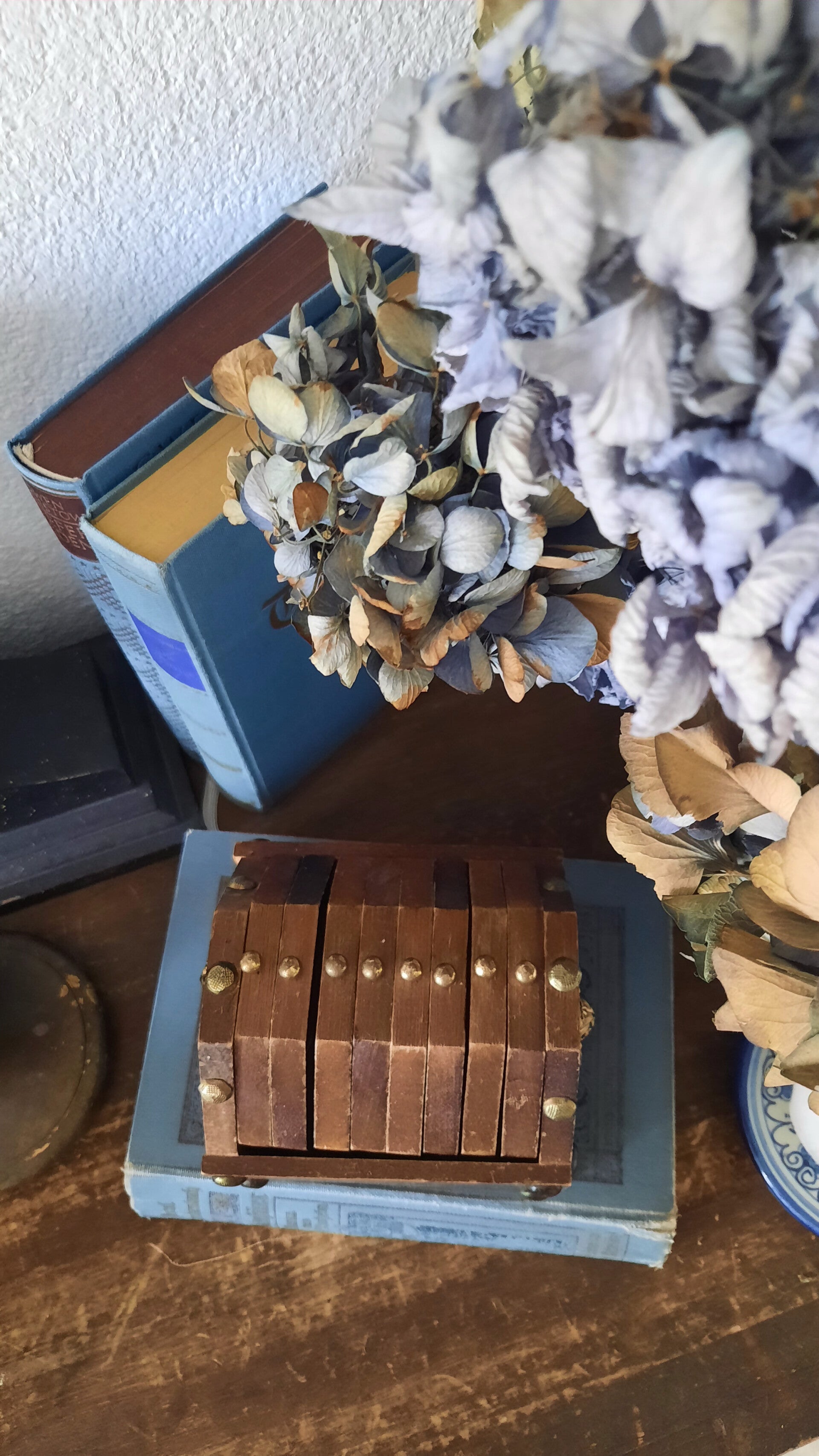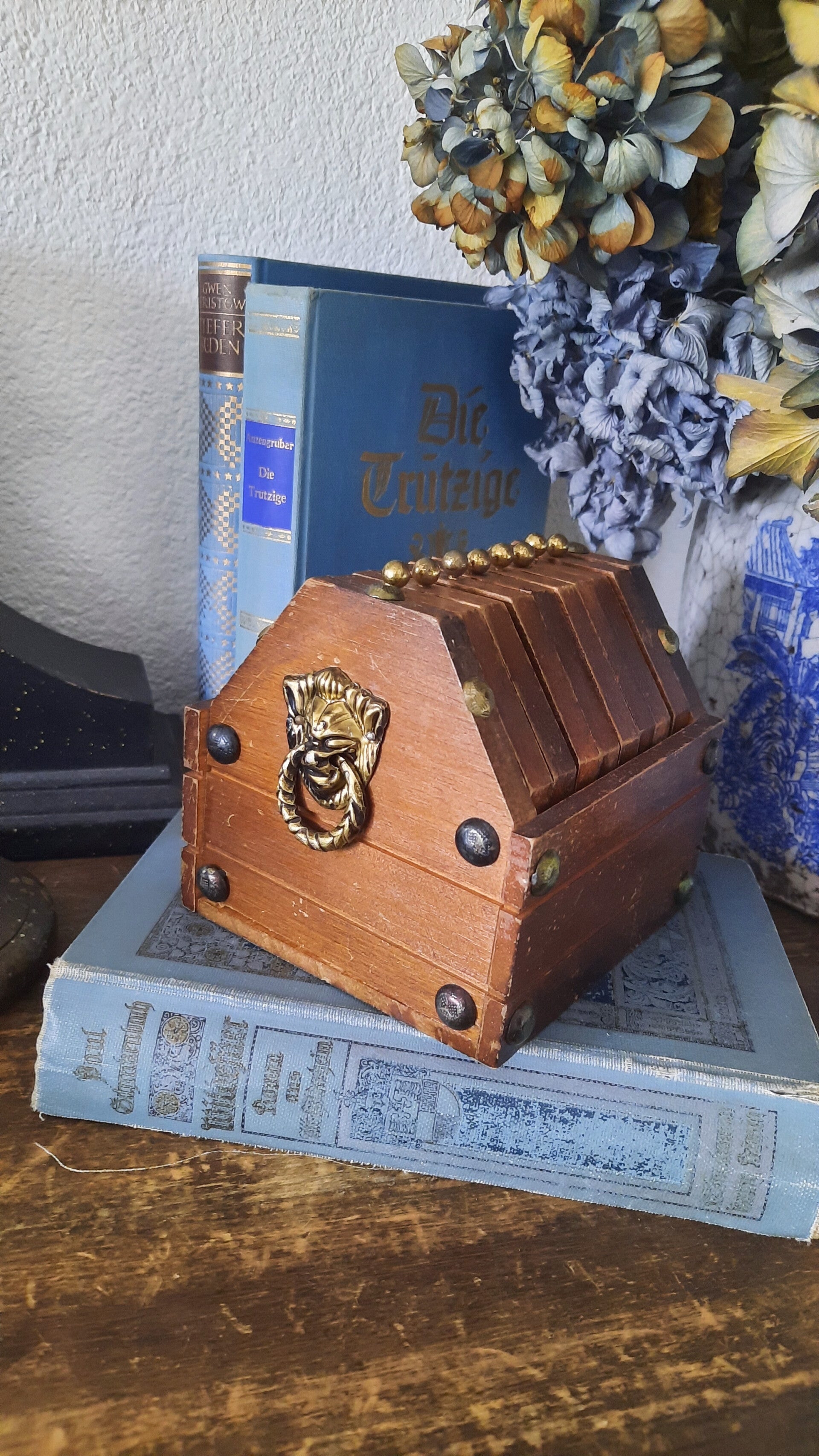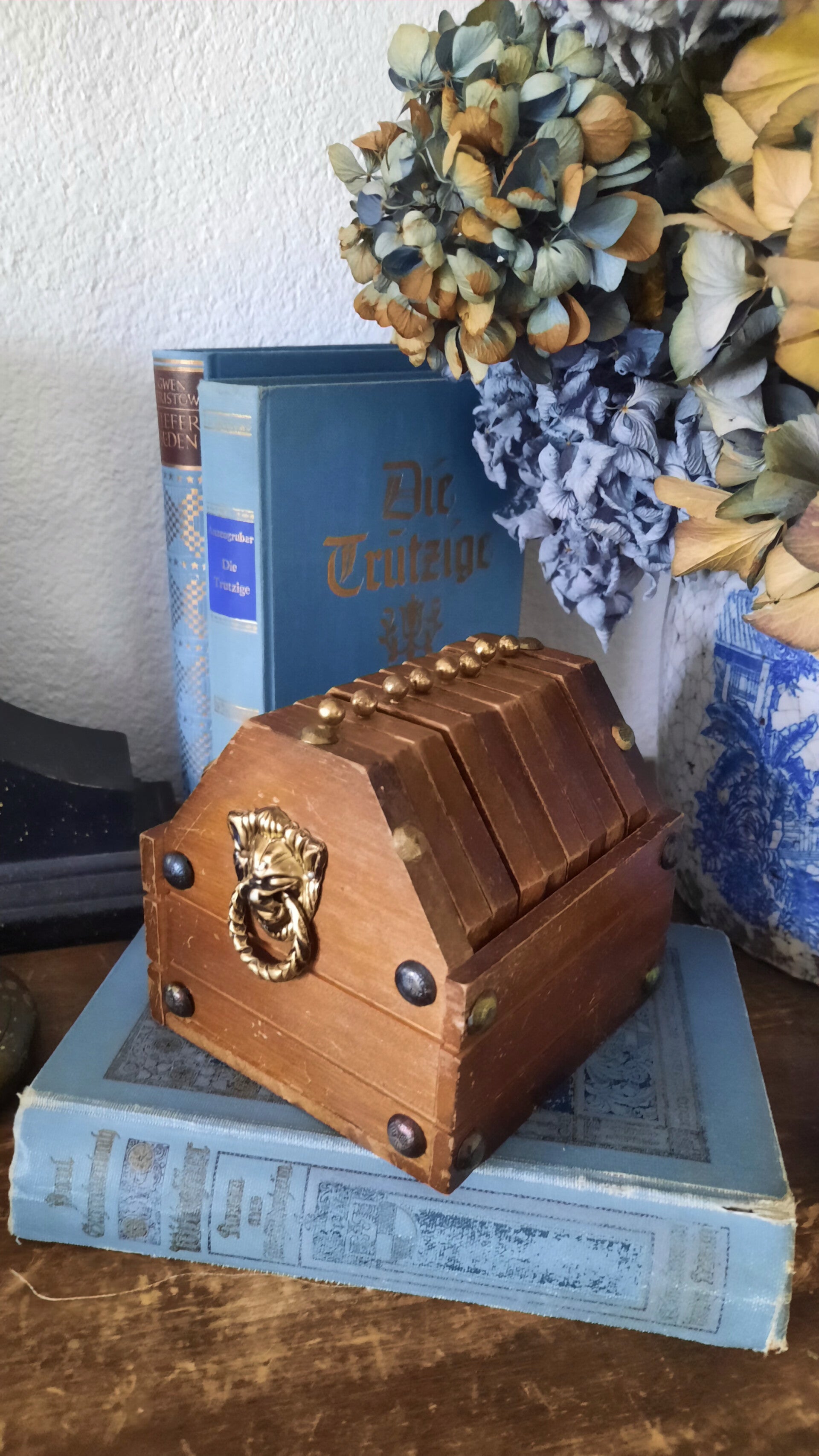 A beautiful wooden treasure chest-shaped box with a set of 8 wooden drink coasters.