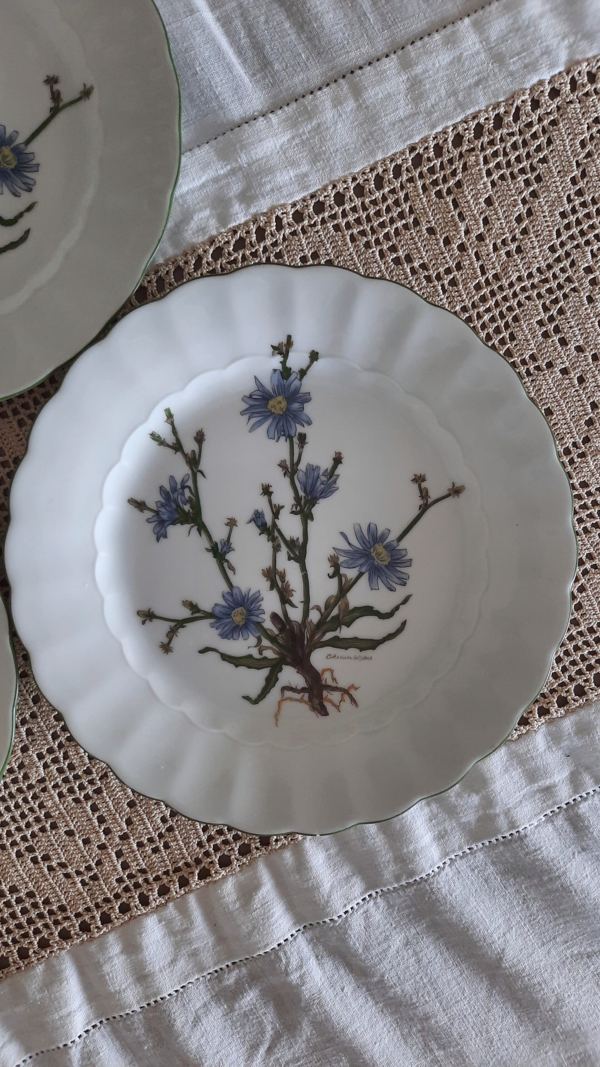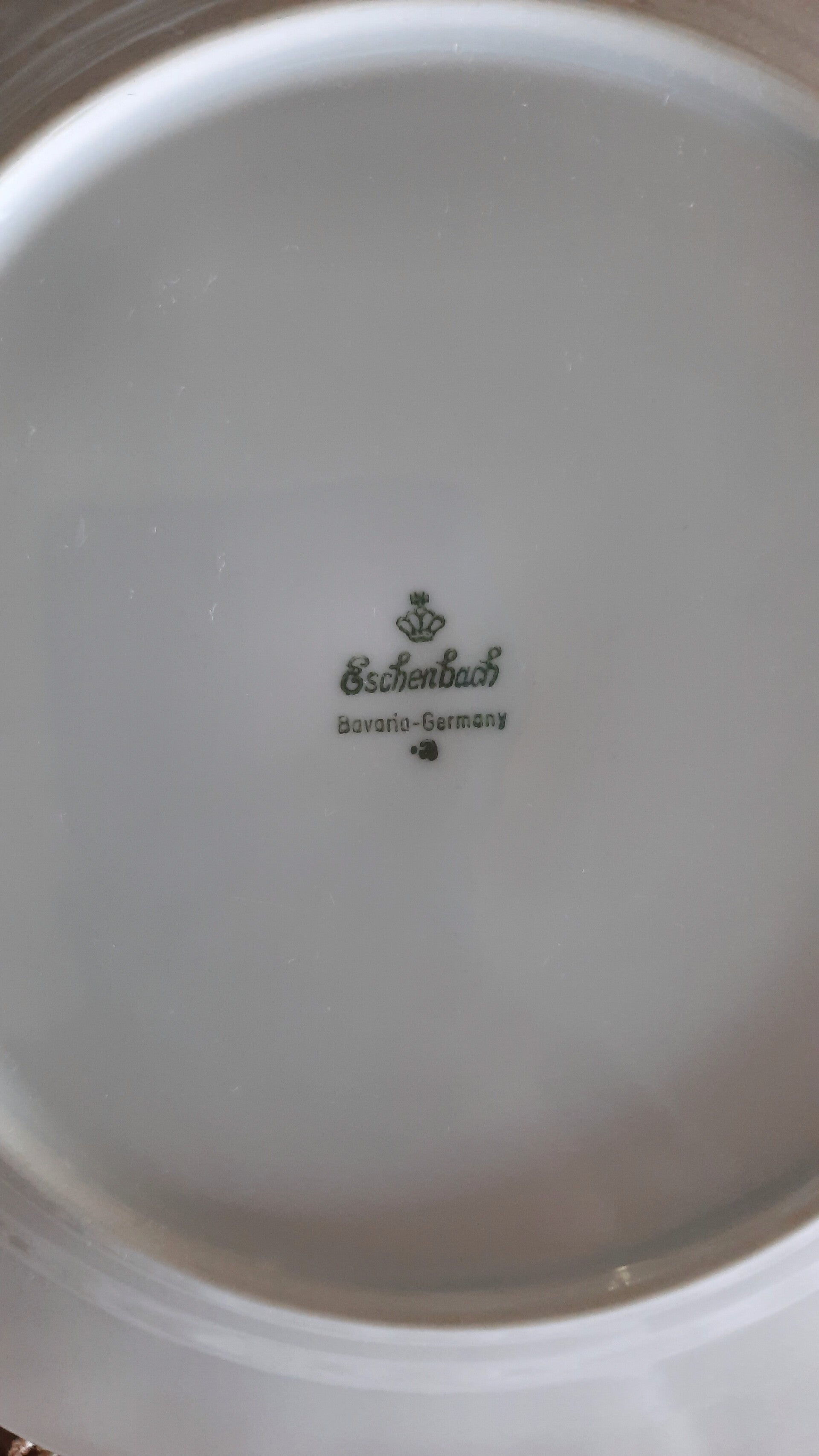 A beautiful vintage set of 6 small porcelain plates in white, featuring a botanical design in the center and a green scalloped rim. Marked on the bottom: Eschenbach Bavaria Germany