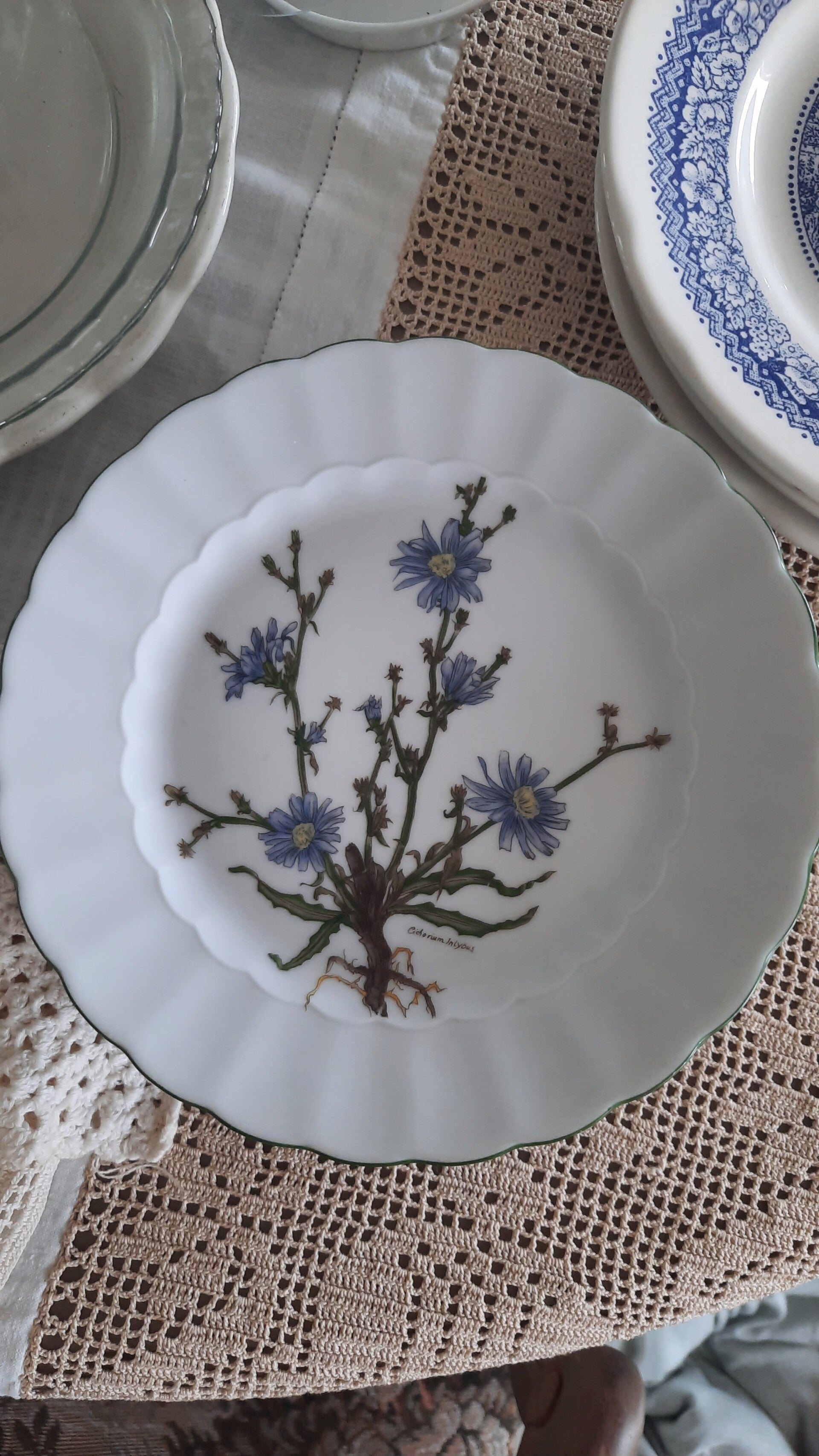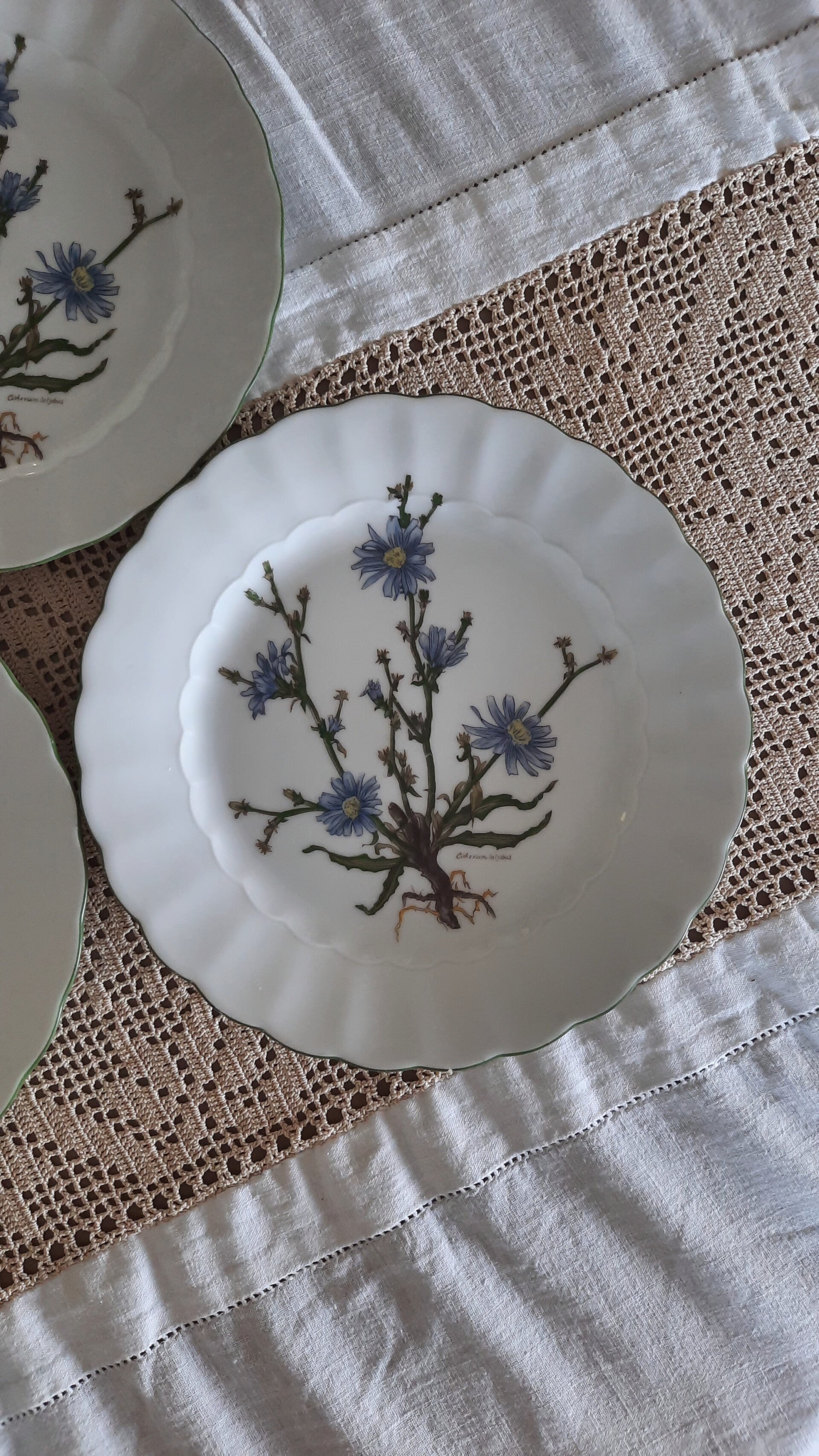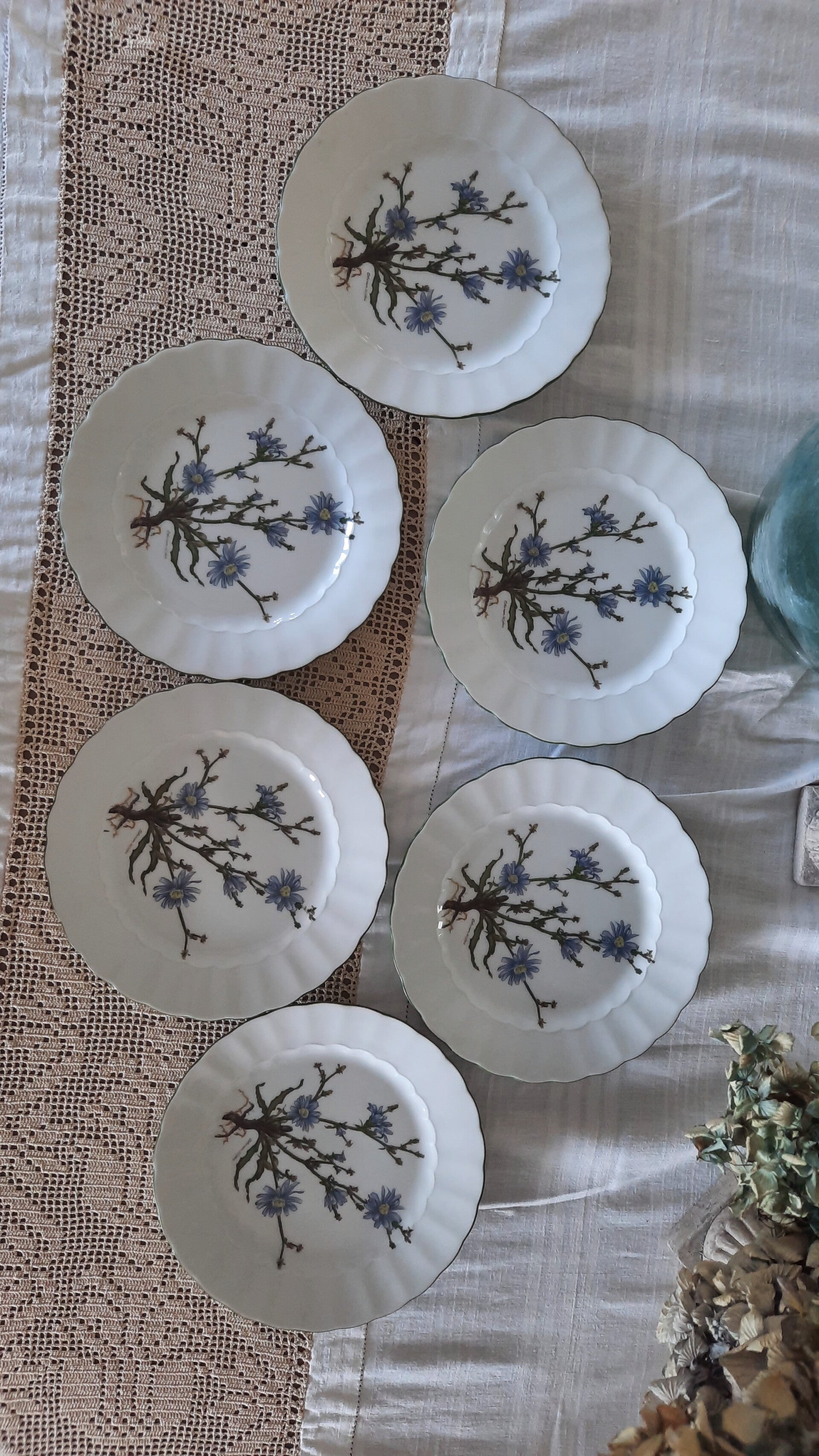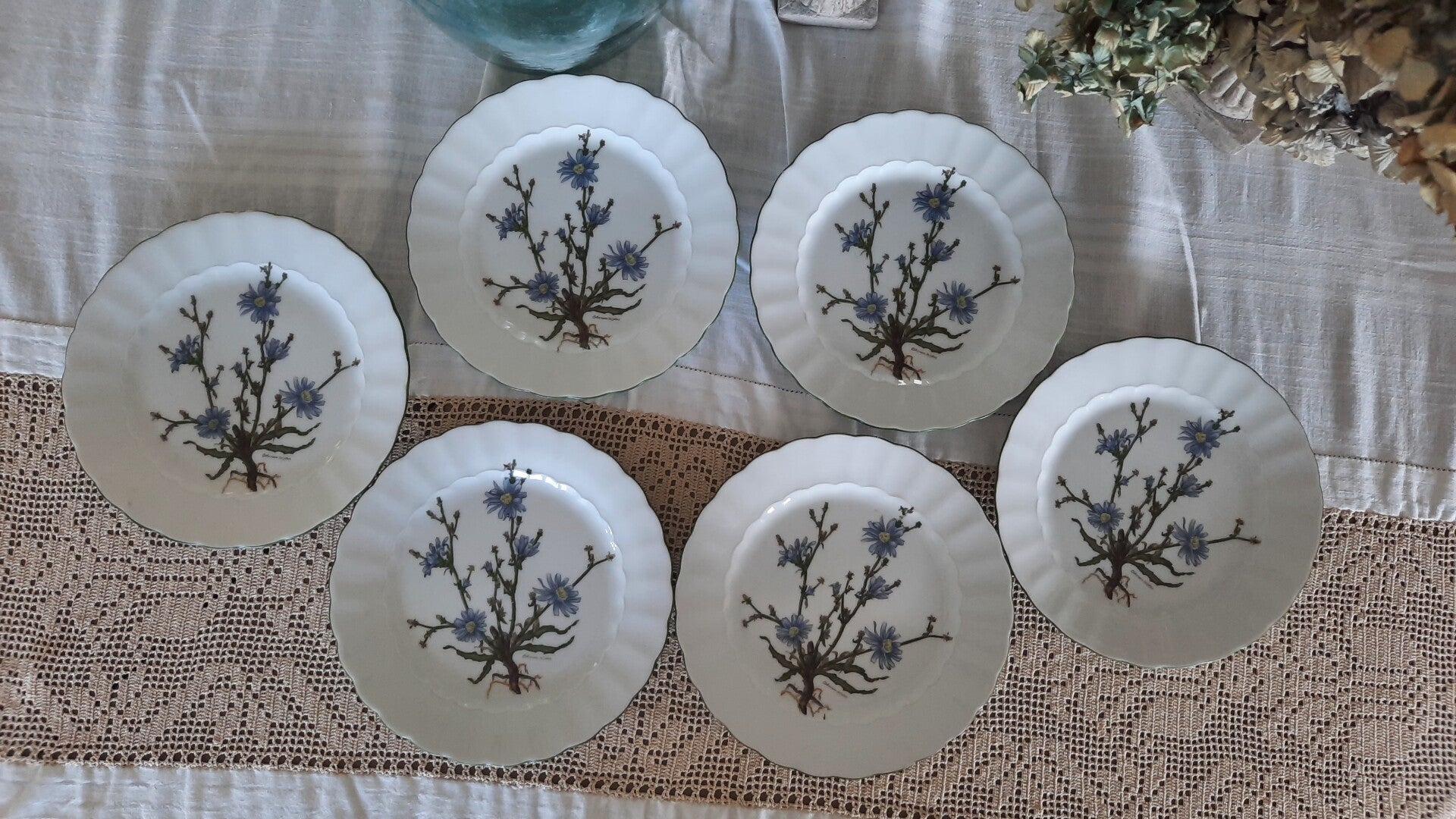 Good vintage condition with no cracks. Three plates have tiny, barely visible chips on the rim.