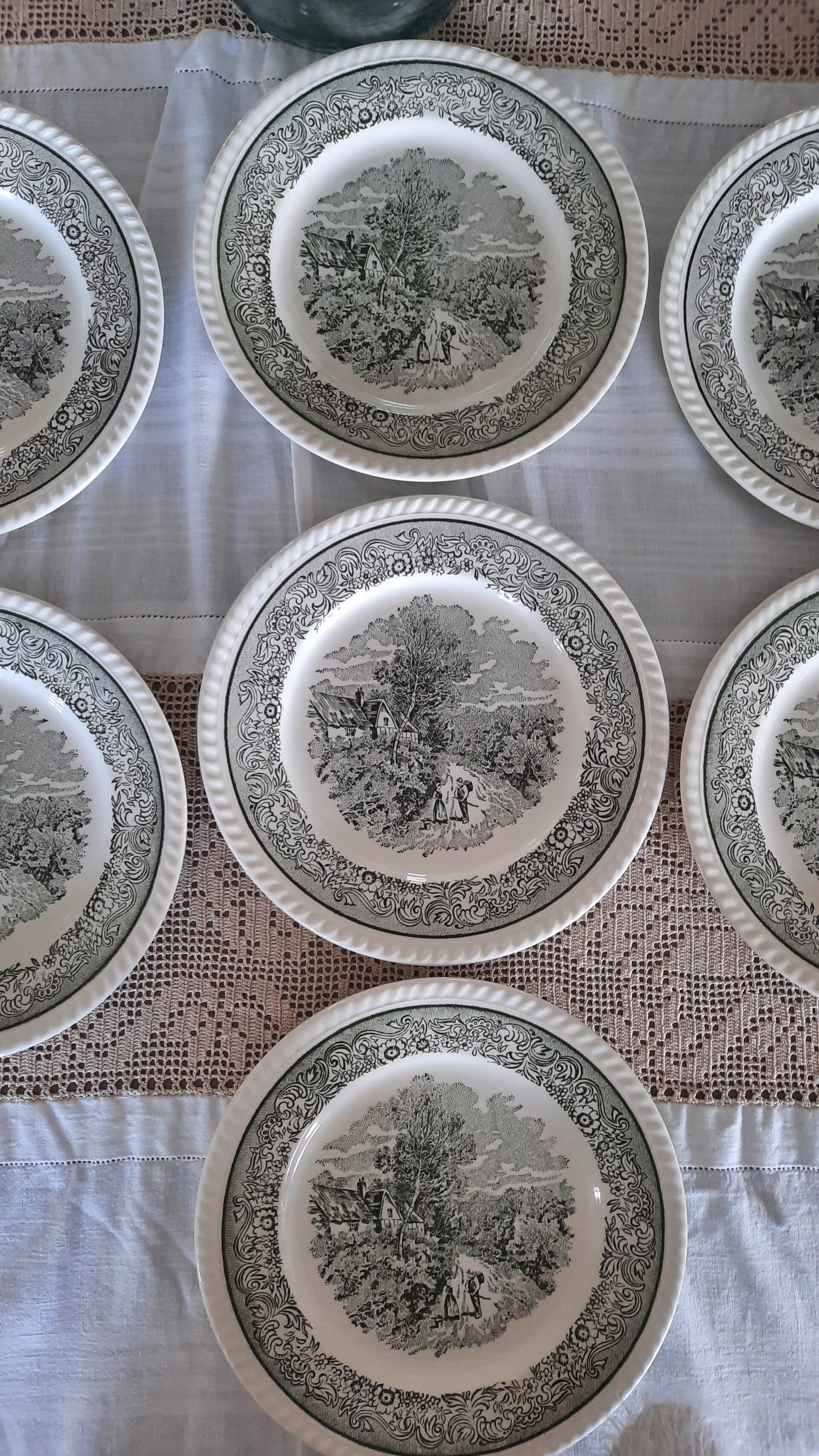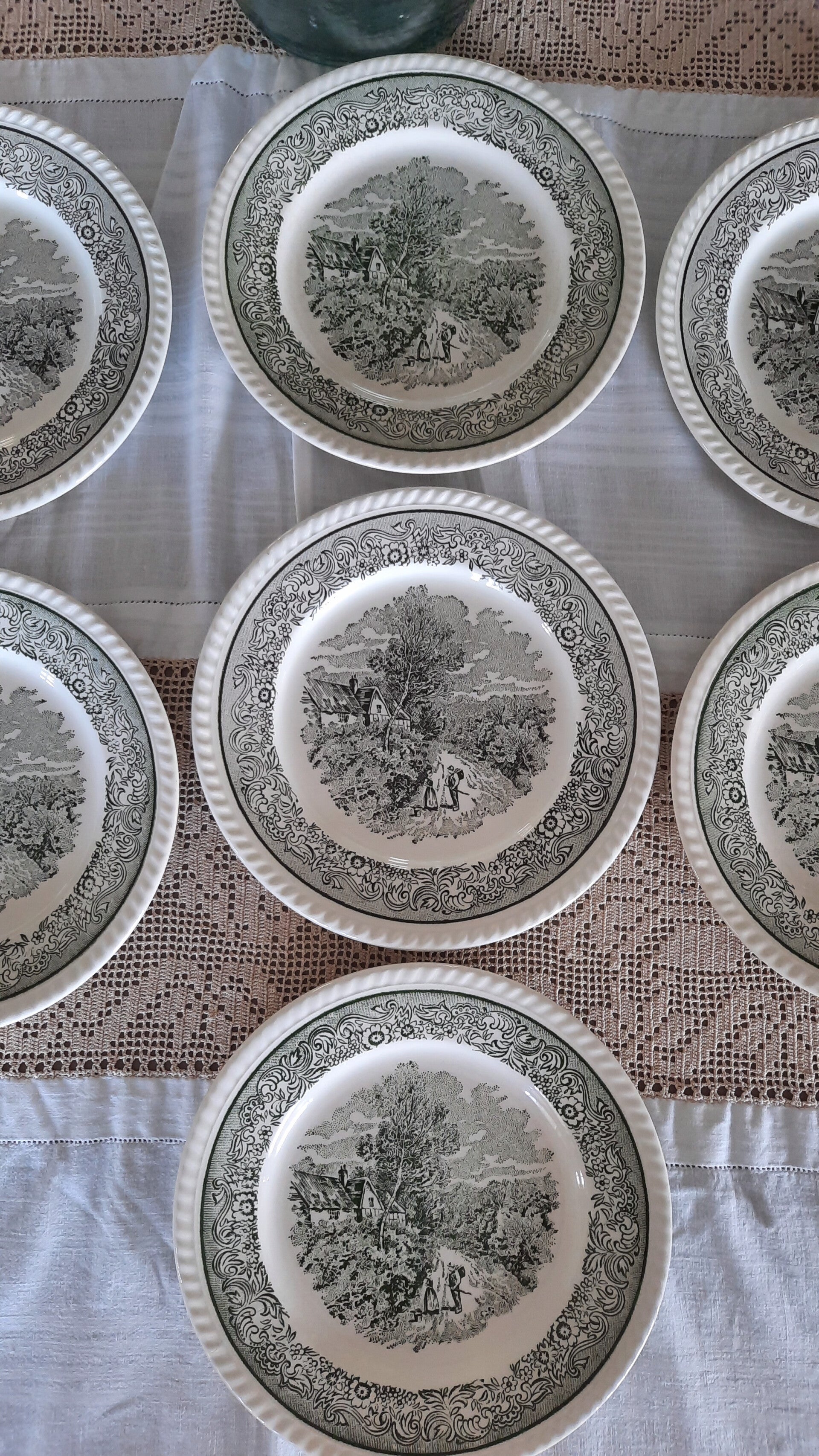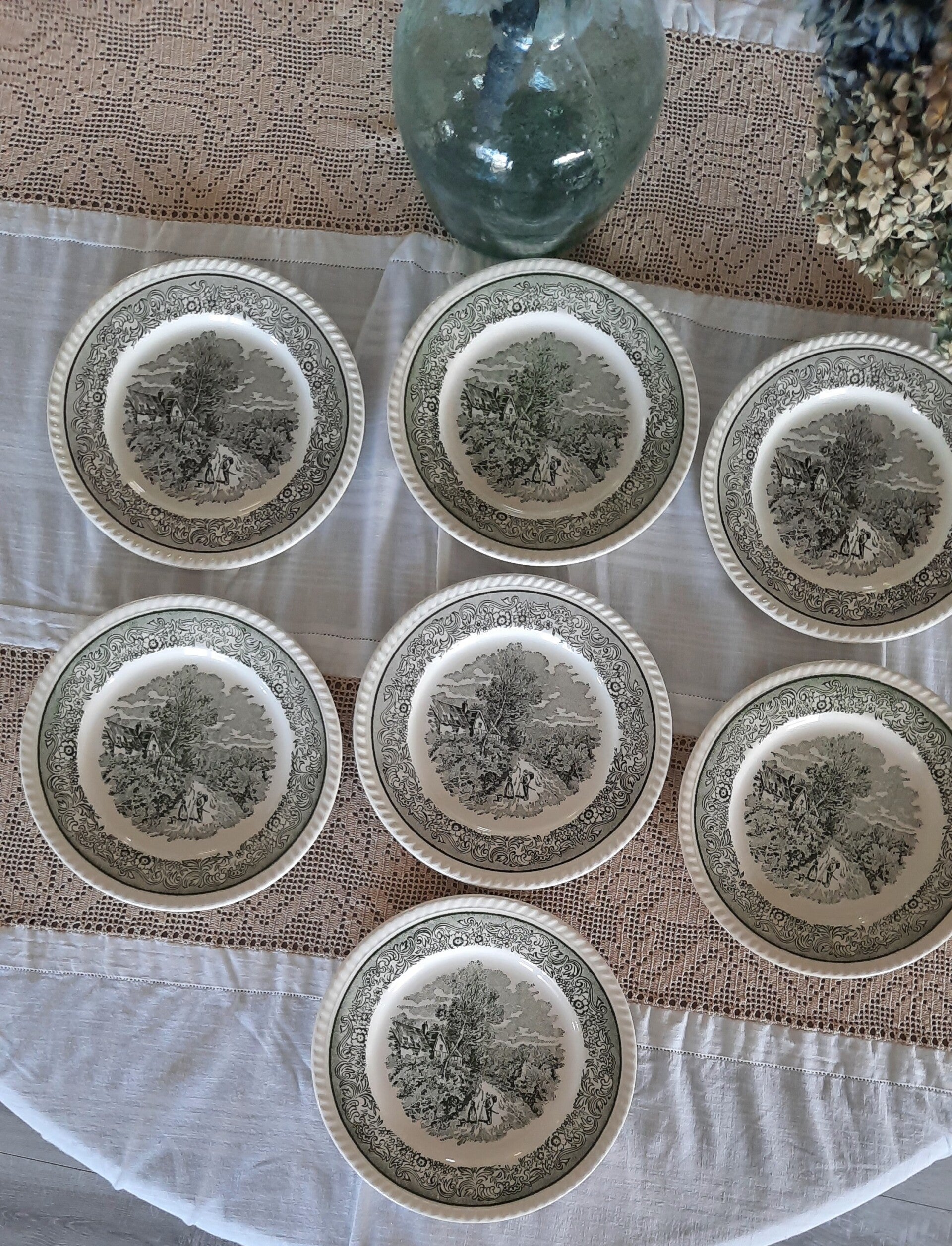 A gorgeous vintage set of 7 plates featuring a rural scene in green and white, with a floral border and raised details on the rim.