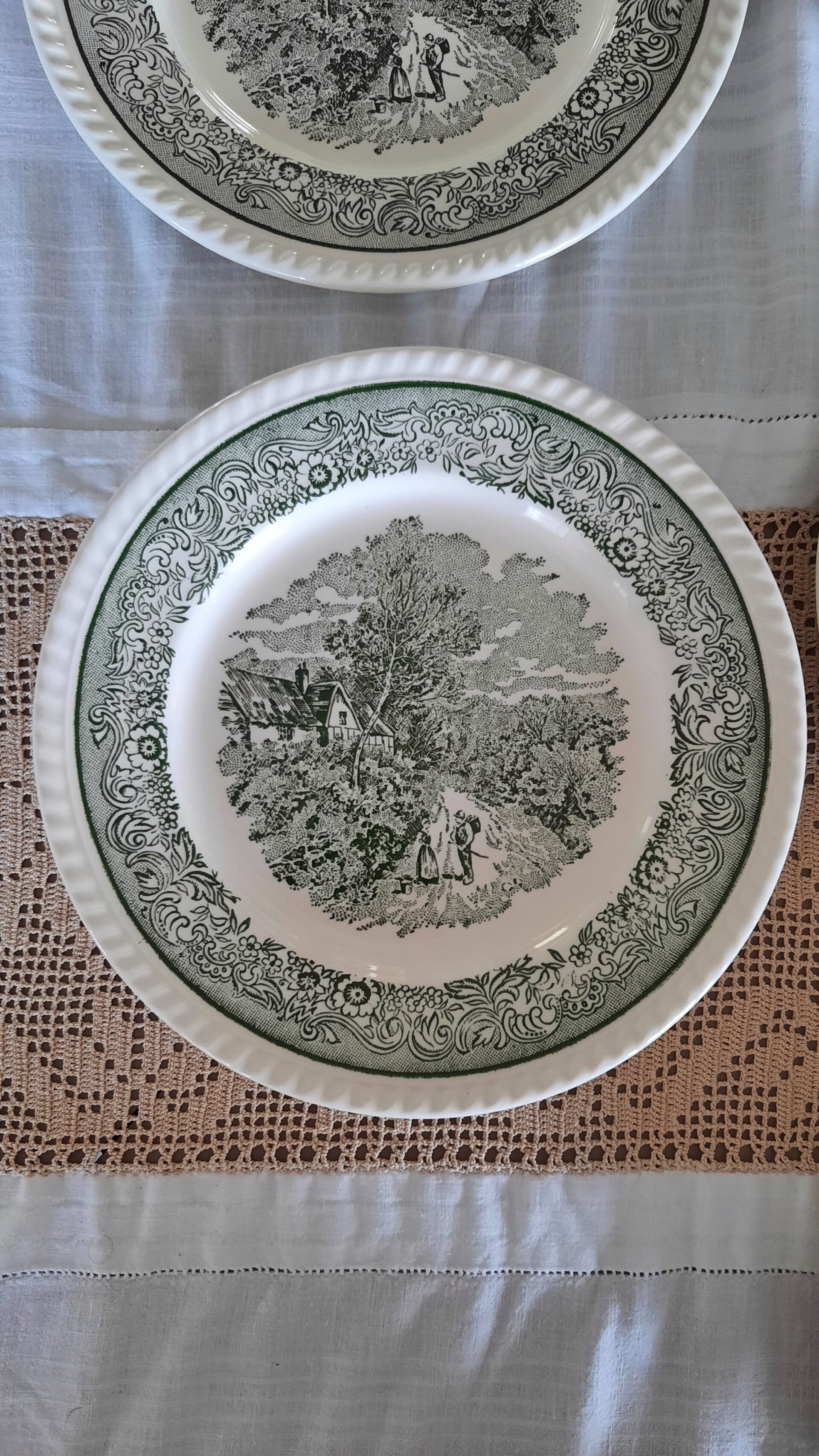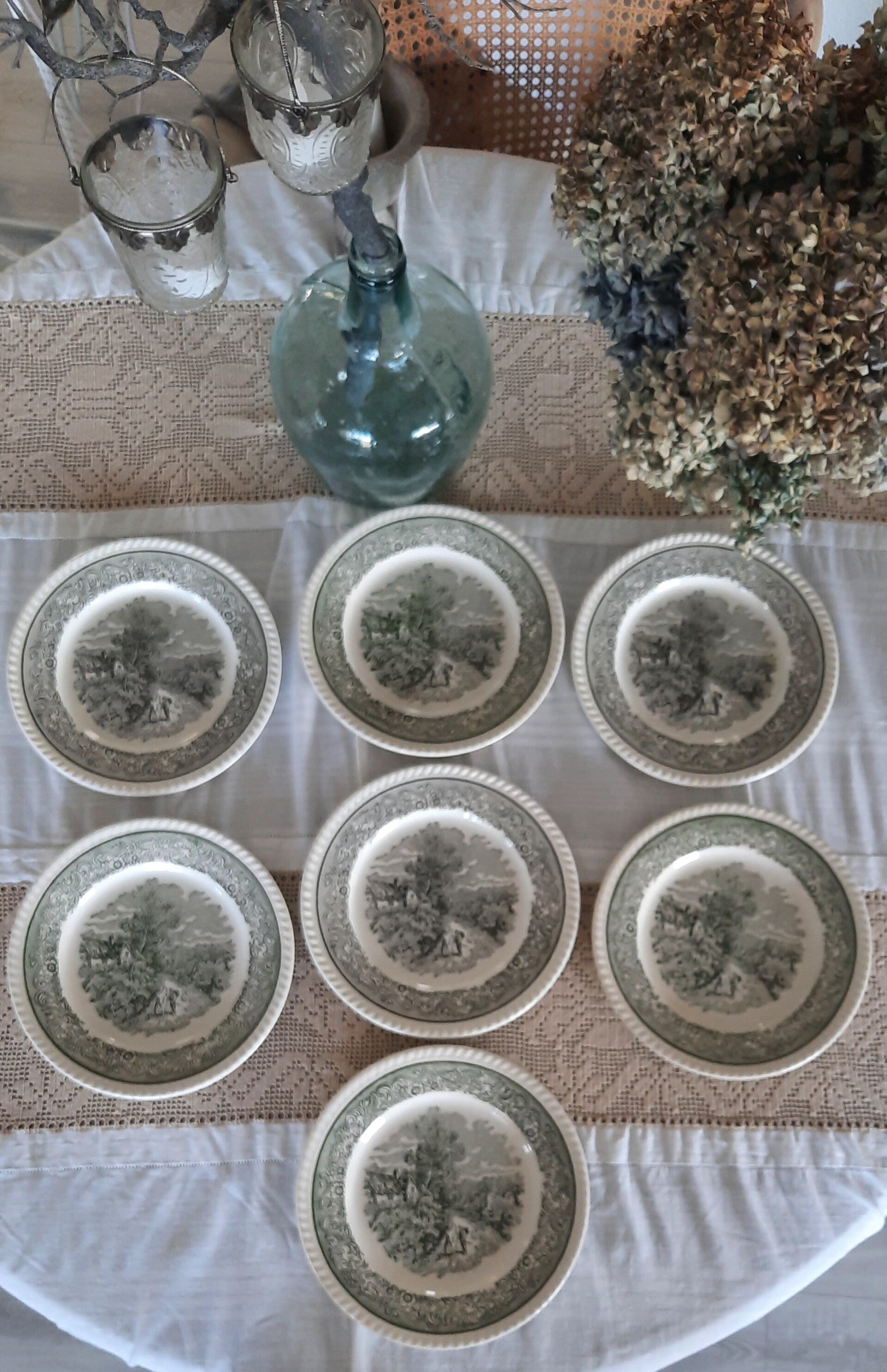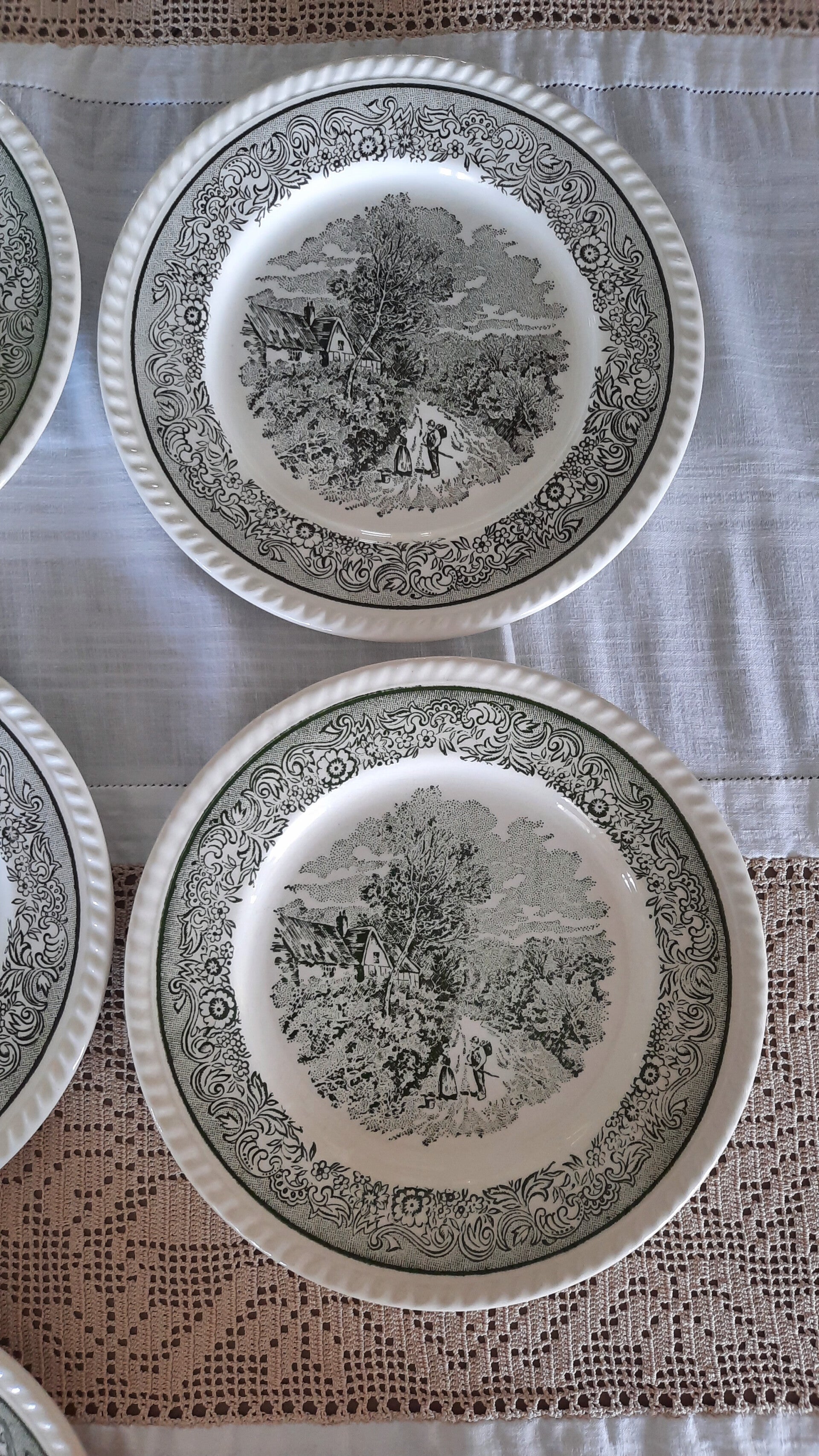 A gorgeous vintage set of 7 plates featuring a rural scene in green and white, with a floral border and raised details on the rim.